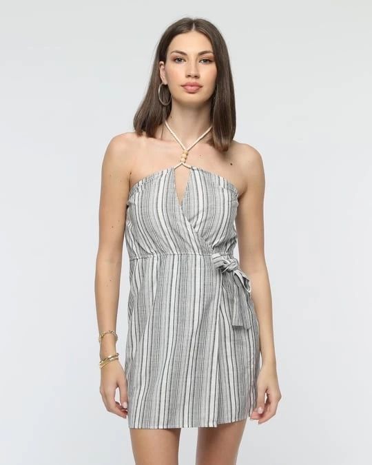 Kuşaklı Çizgili Mini Keten Elbise