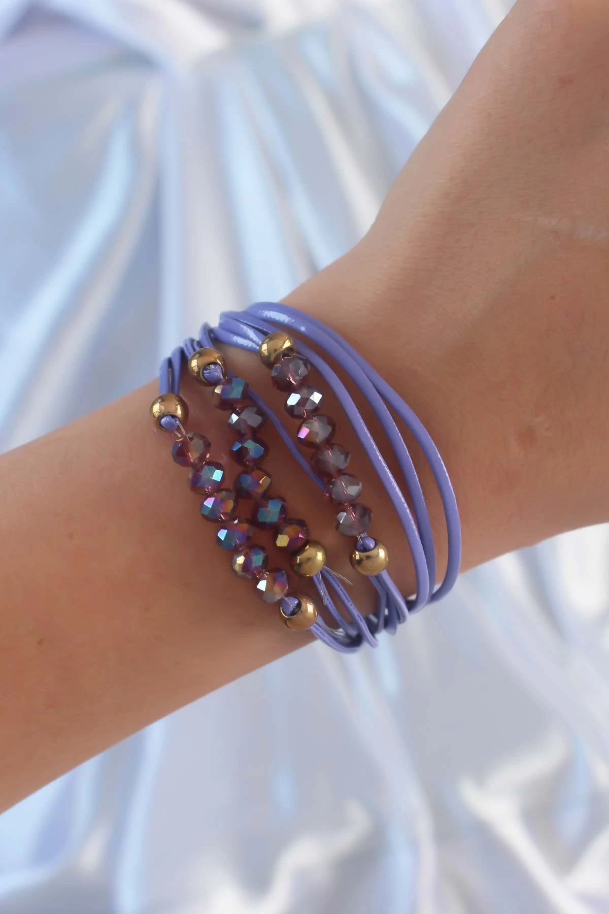 Lila Renk Zirkon Taşlı İpli Çoklu Bileklik