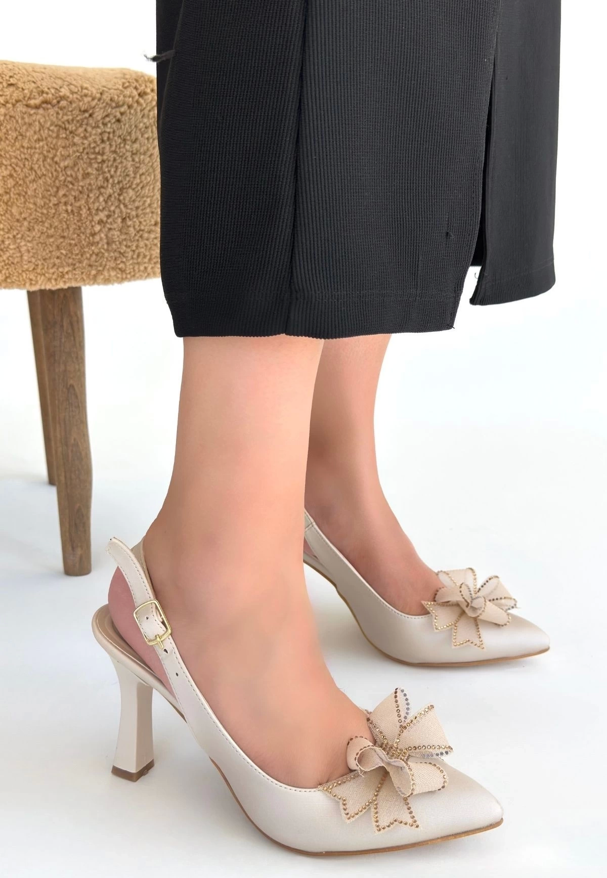 Mewi Bej Saten Topuklu Ayakkabı