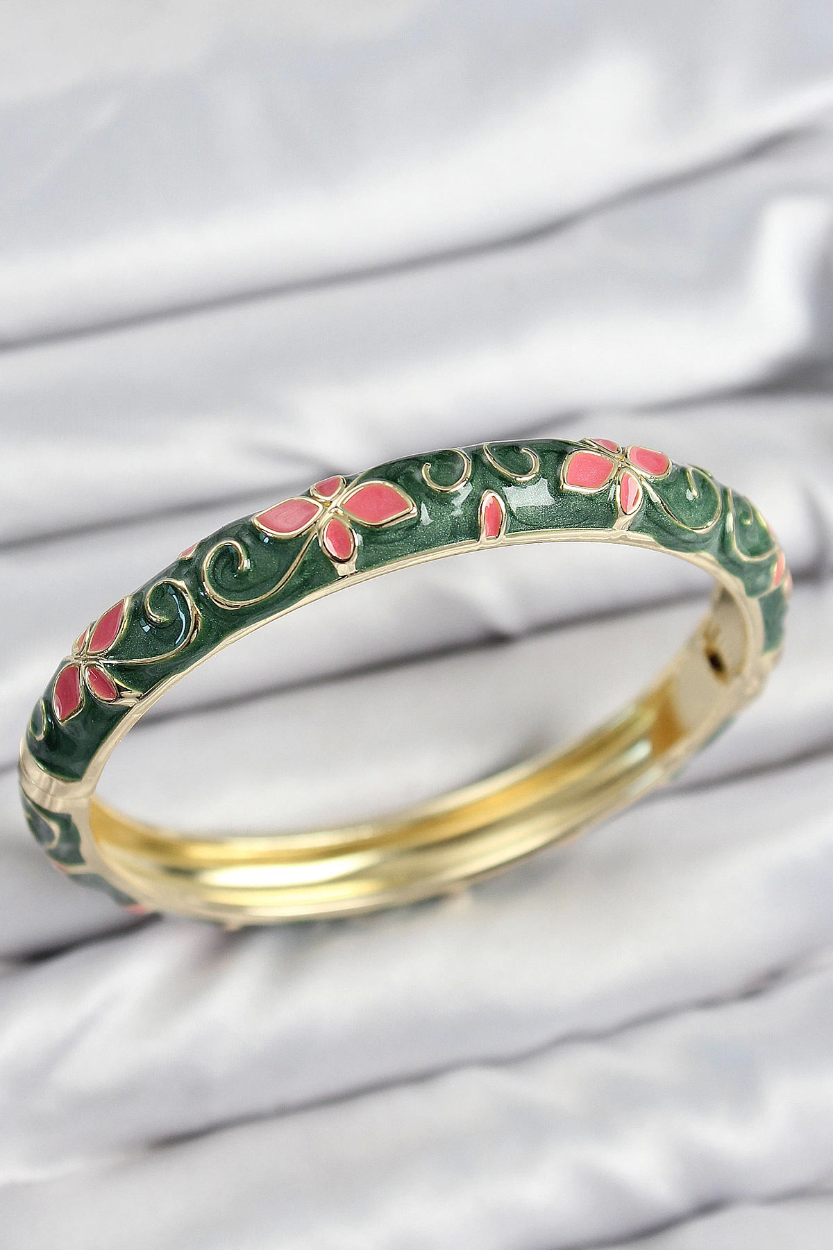 Mineli Pirinç Yeşil Çiçek Motifli Gold Kadın Kelepçe