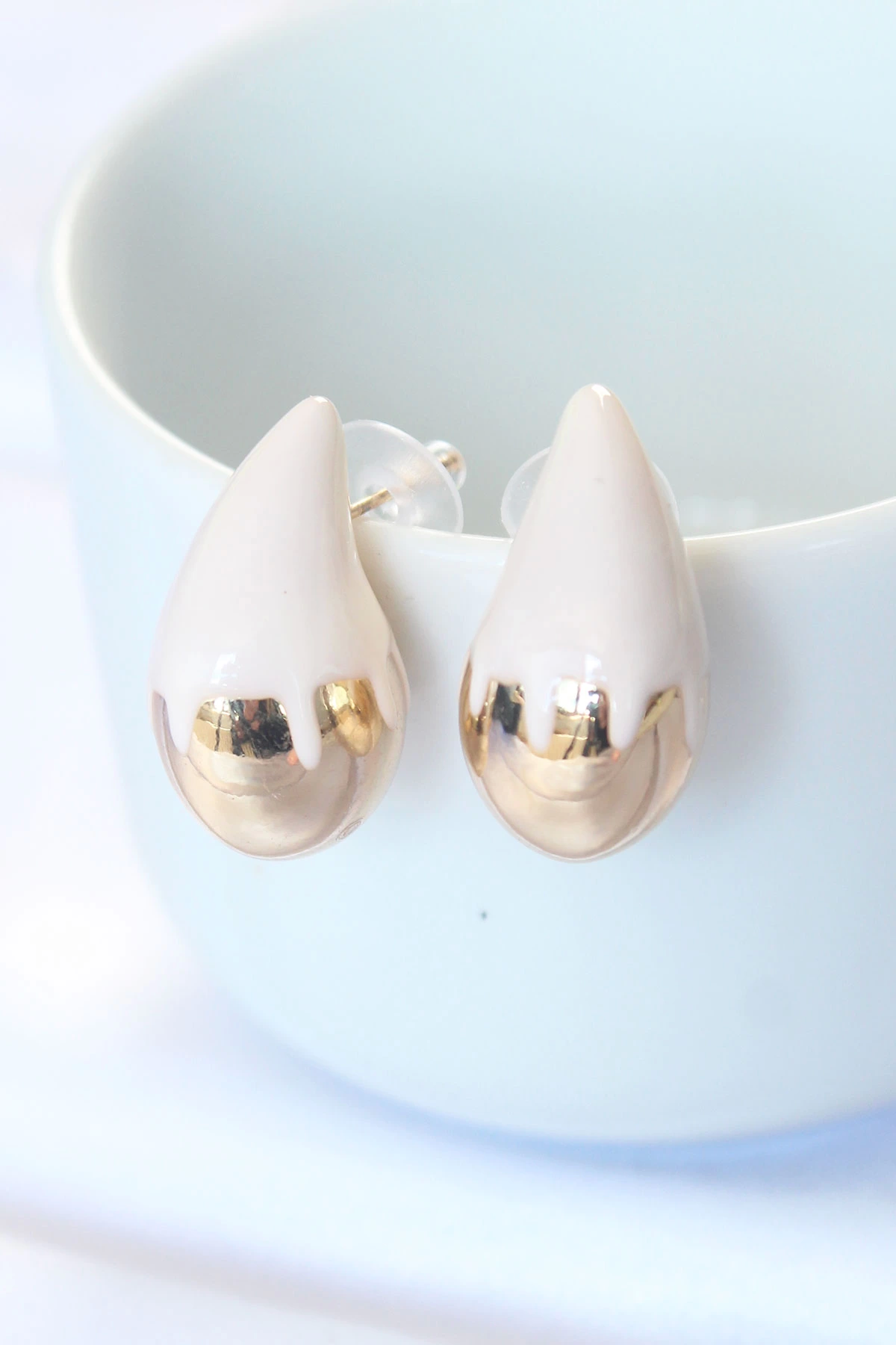 Minimal Beyaz Mineli Çift Renk Damla Küpe