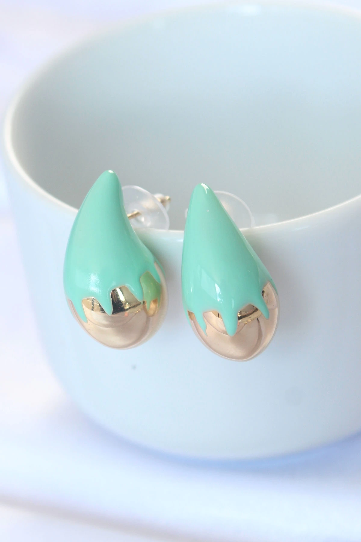 Minimal Turkuaz Mineli Çift Renk Damla Küpe