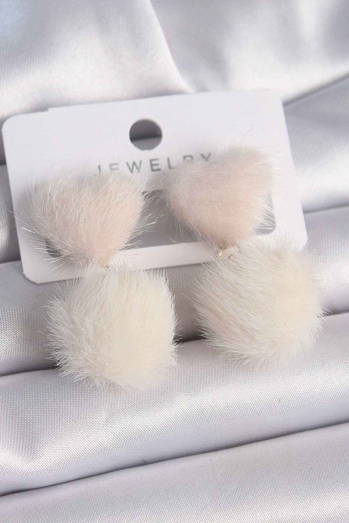 Pembe Renk Tüylü Kalp Ponpon Model Kadın Küpe