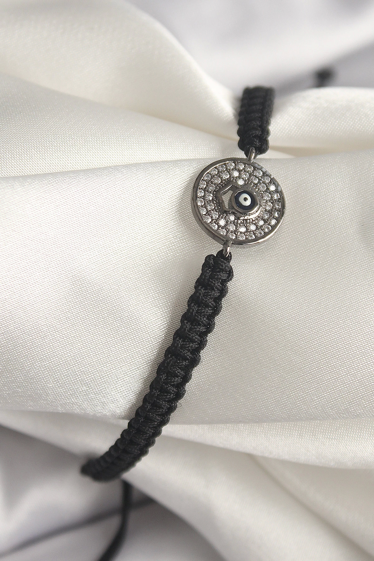 Pirinç Füme Renk Zirkon Taşlı Nazar Boncuk İşleme Makrome Asansörlü Model Kadın Bileklik
