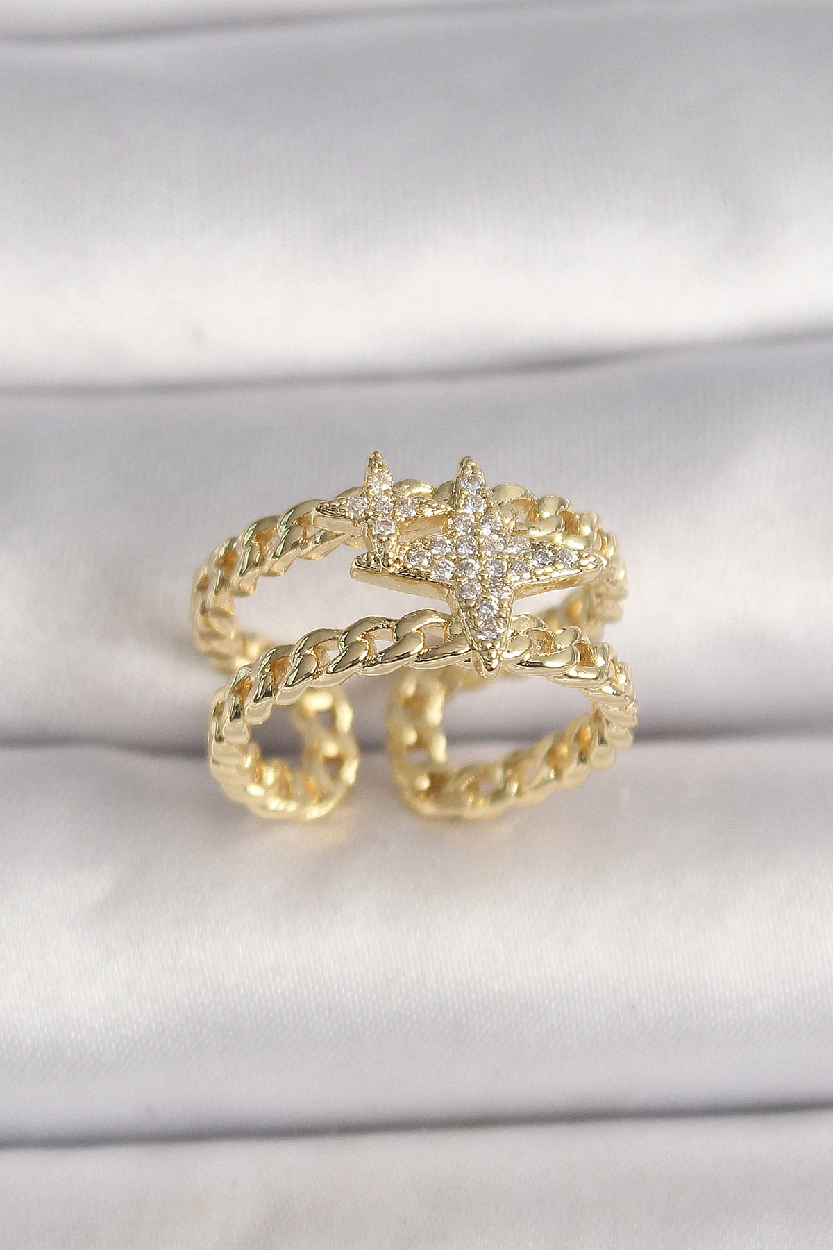 Pirinç Gold Renk 2'li Zincir Zirkon Taşlı Yıldız Figür Kadın Yüzük