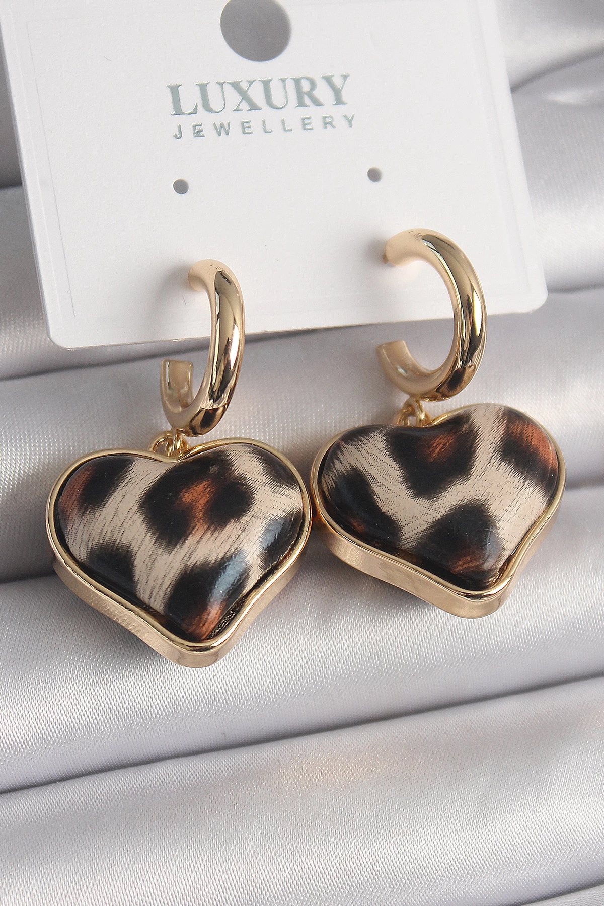 Pirinç Gold Renk 3d Kalp Leopar Model Kadın Küpe