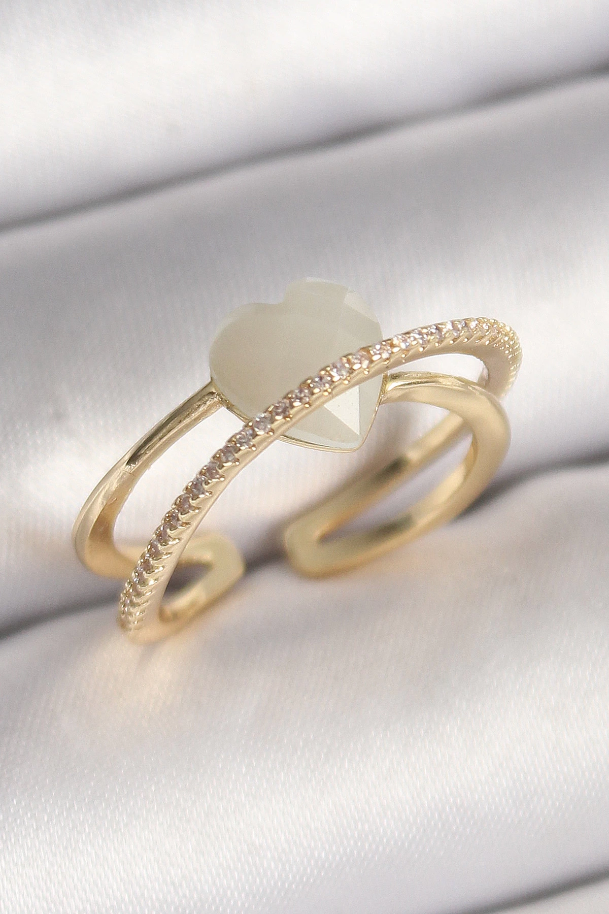 Pirinç Gold Renk Beyaz Kristal Kalp Model Zirkon Taş Detay Kadın Yüzük