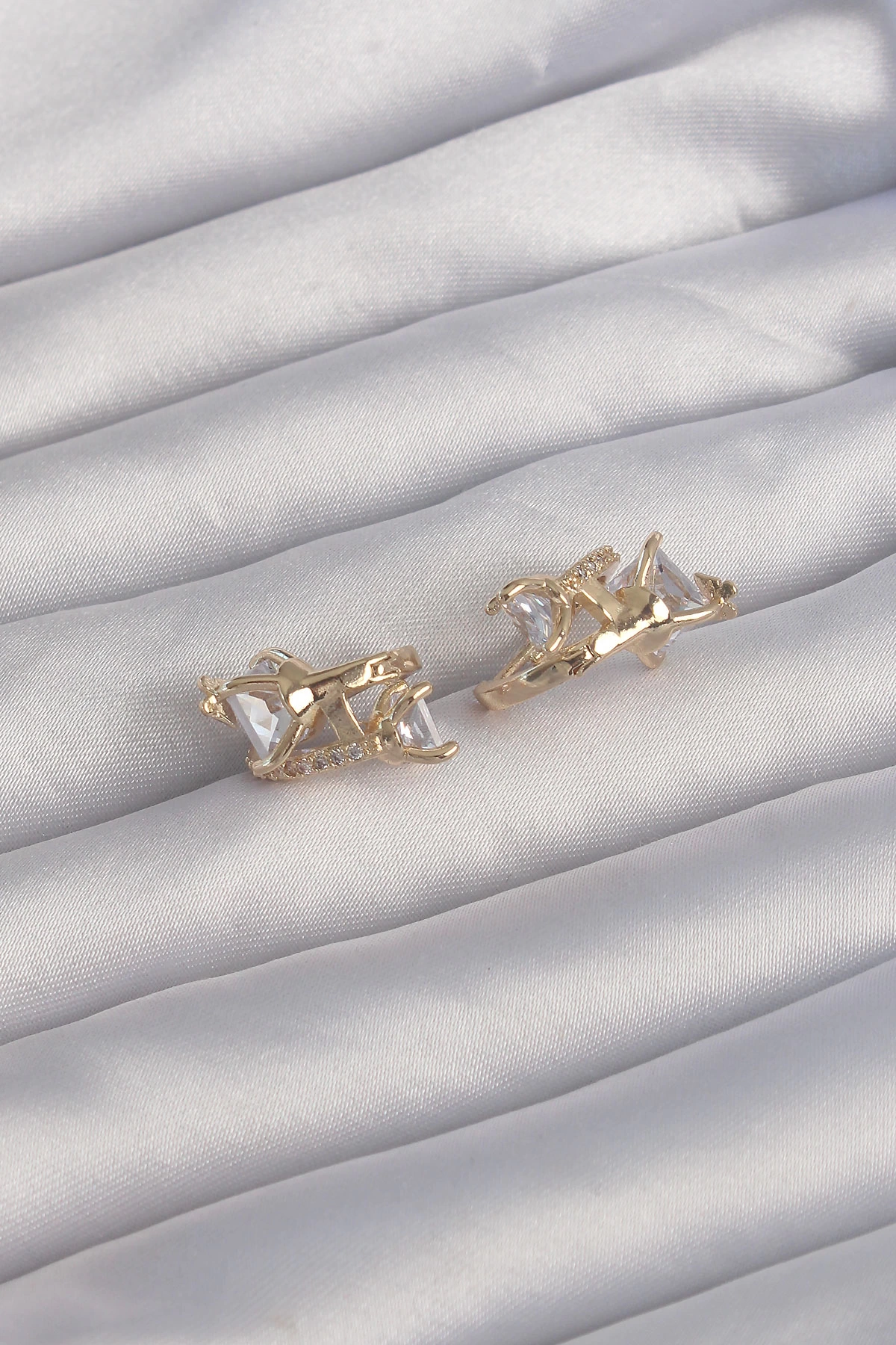 Pirinç Gold Renk İri Zirkon Taşlı Kıvrımlı Minimal Kelebekli Halka Küpe