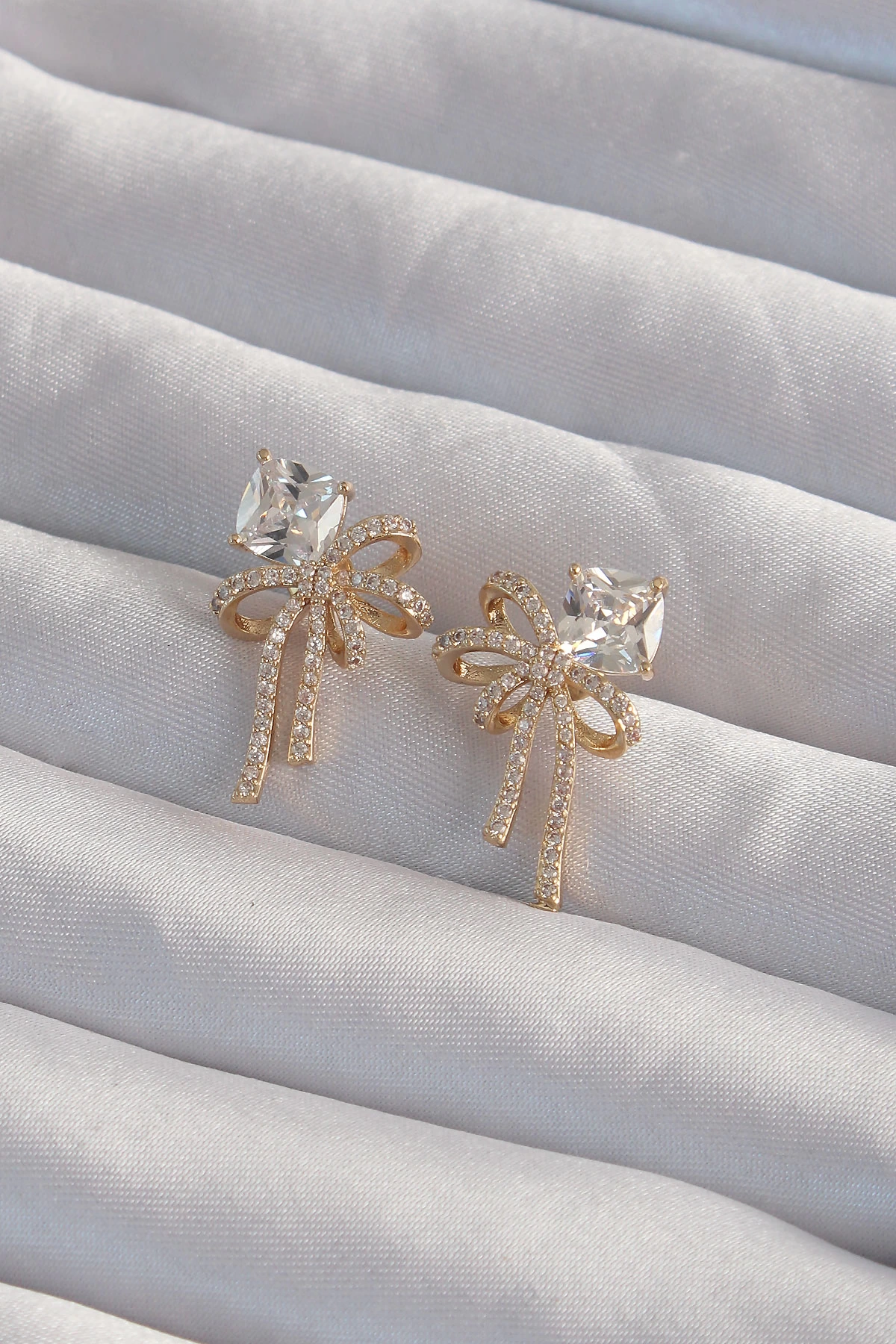 Pirinç Gold Renk Kare Zirkon Taşlı Fiyonk Küpe