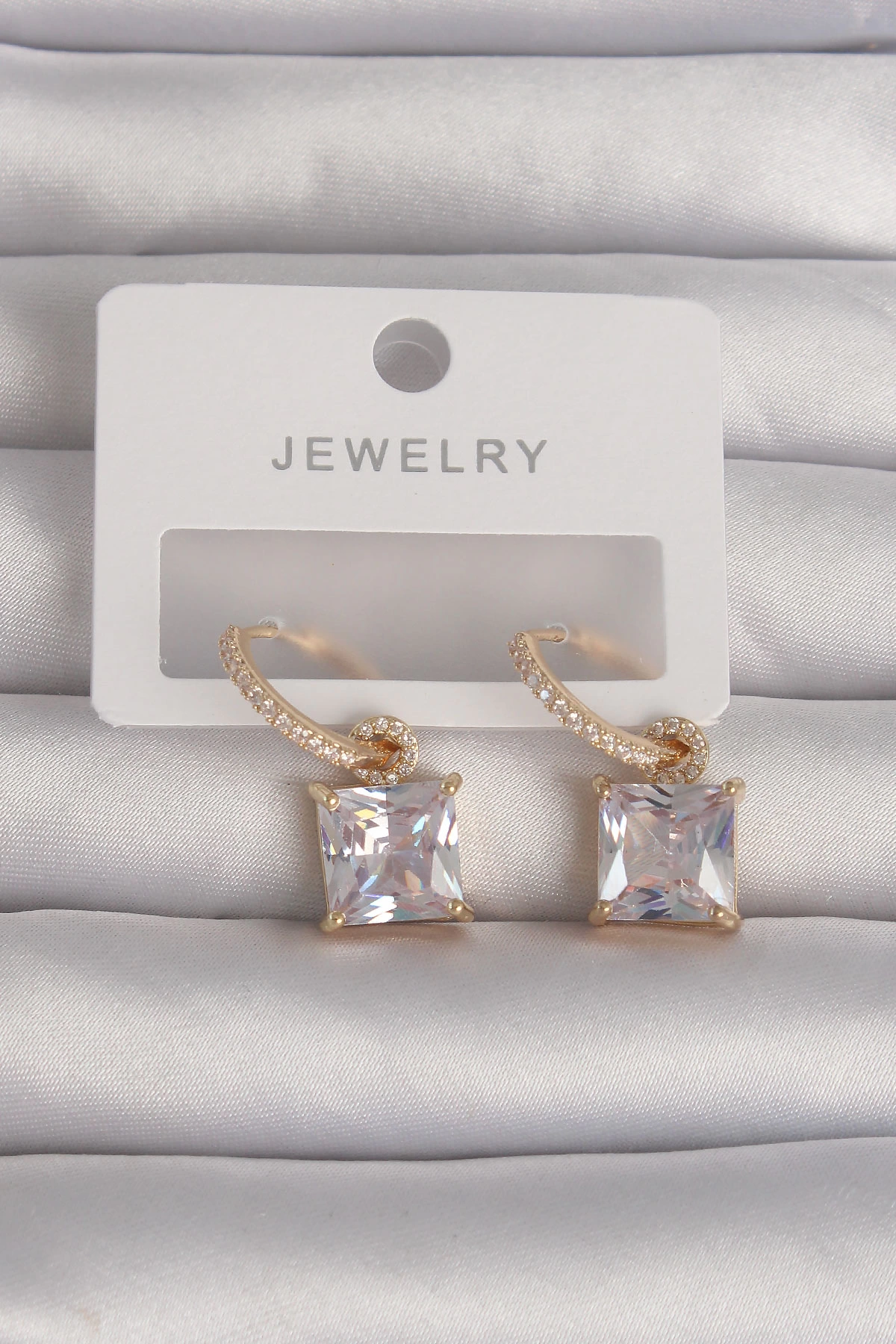 Pirinç Gold Renk Kare Zirkon Taşlı Halka Küpe