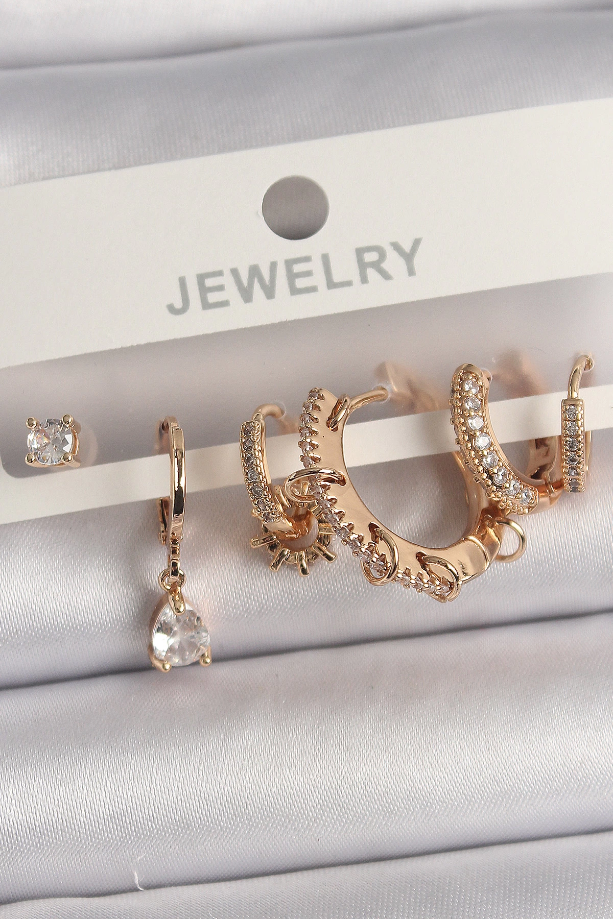 Pirinç Gold Renk Sallantı Zirkon Taşlı Halka Model Damla Zirkon Taş Detay Çoklu Kadın Küpe Seti