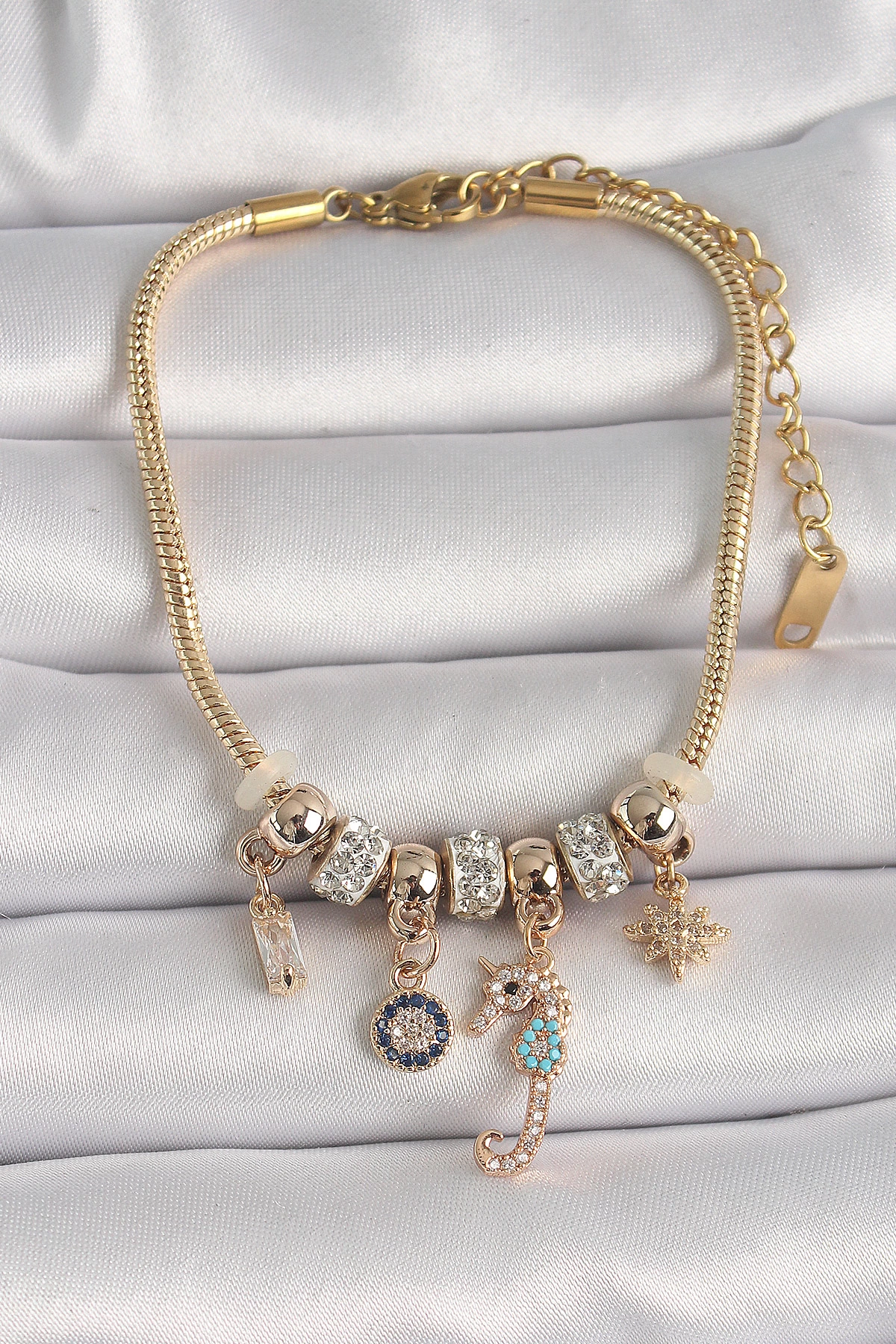 Pirinç Gold Renk Zincir Sallantı Zirkon Taşlı Deniz Atı Figür Nazar Boncuk Detay Kadın Bileklik