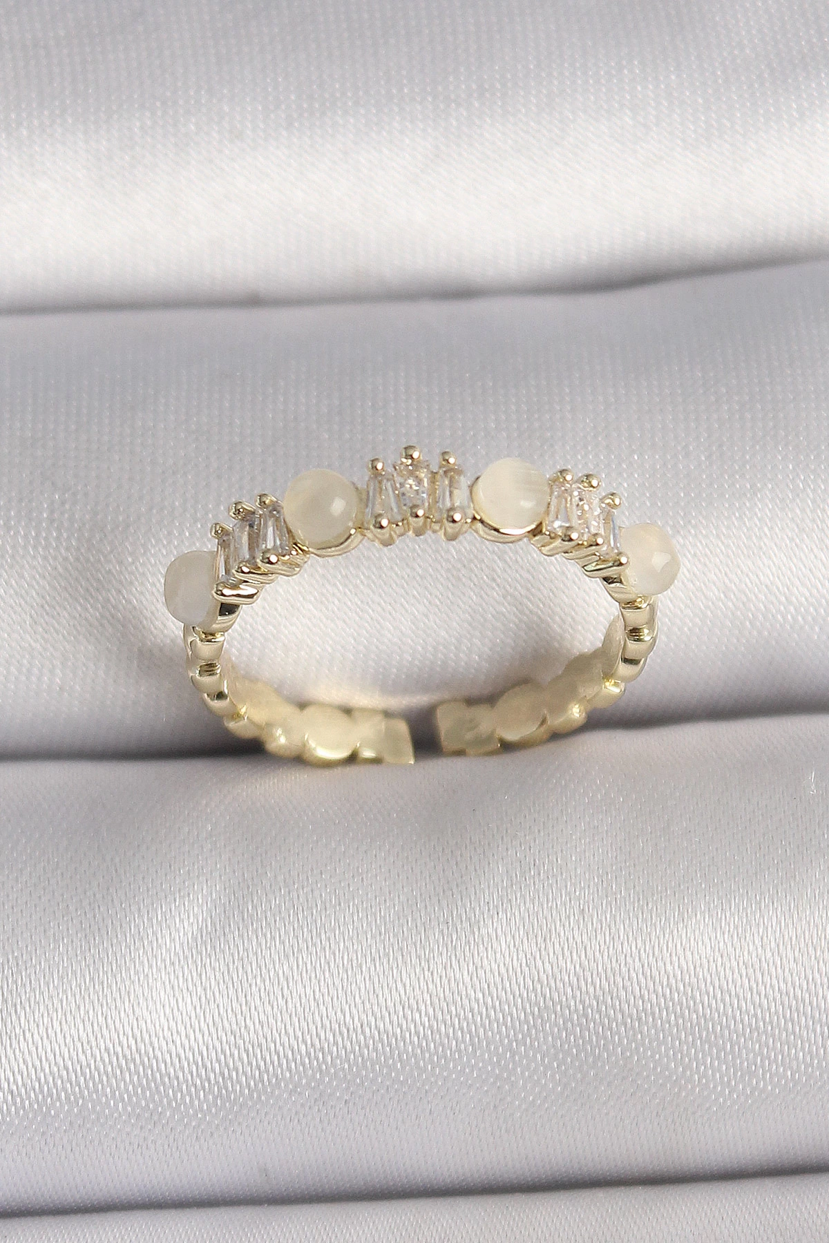 Pirinç Gold Renk Zirkon Taşlı Beyaz Mineli Ayarlanabilir Yüzük