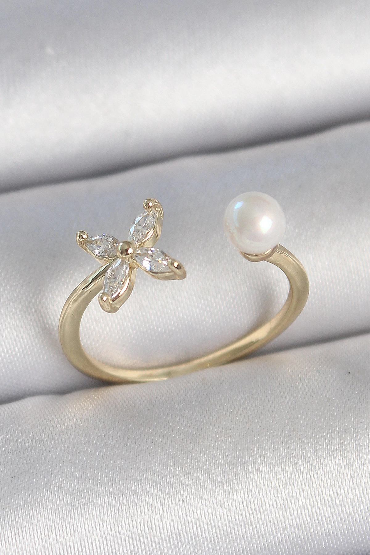 Pirinç Gold Renk Zirkon Taşlı Çiçek Model İnci Detay Ayarlanabilir Kadın Yüzük