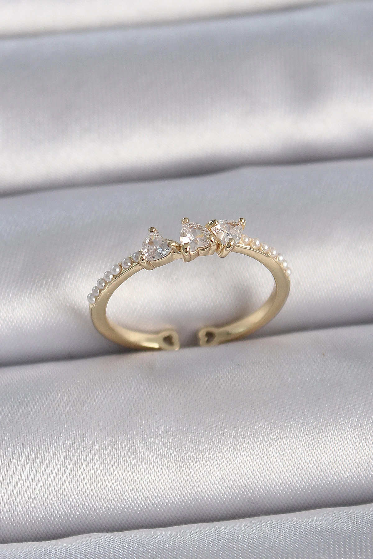 Pirinç Gold Renk Zirkon Taşlı Kalp İnci Detaylı Ayarlanabilir Model Kadın Yüzük