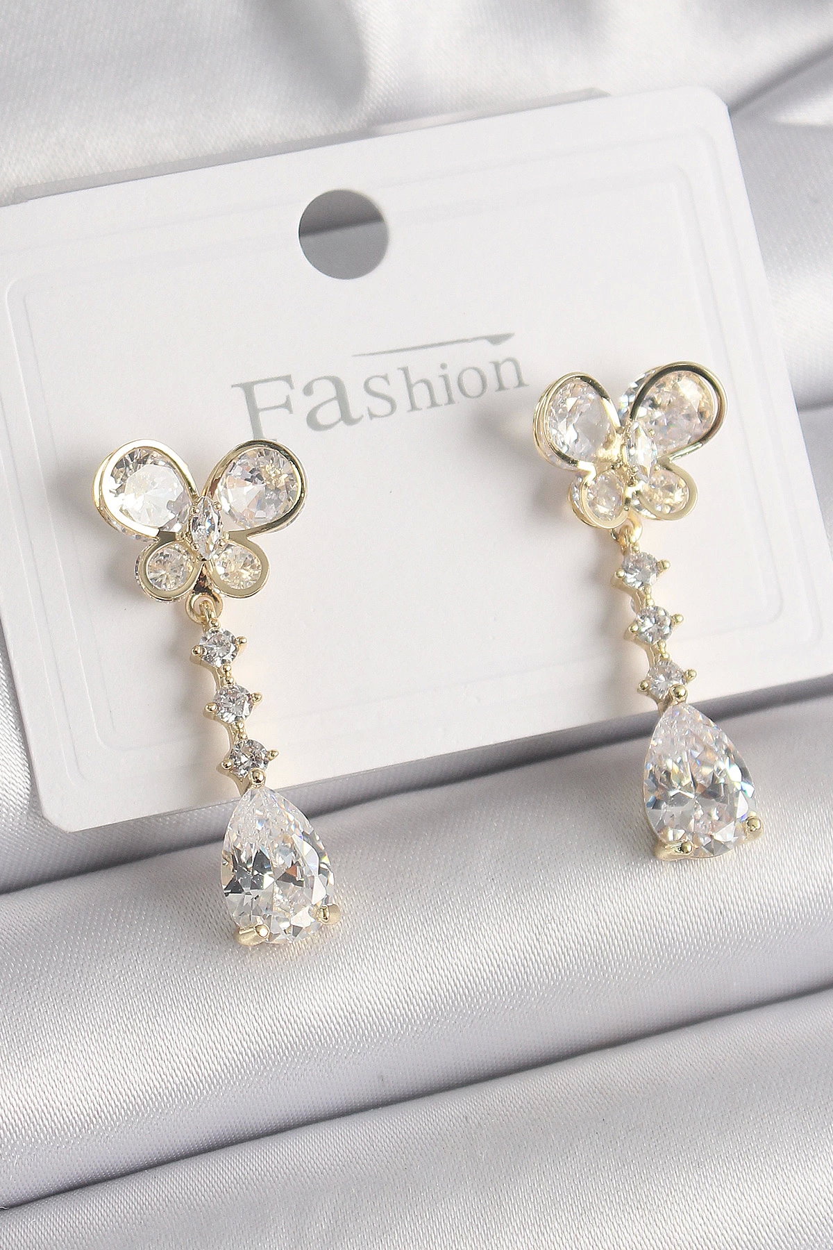Pirinç Gold Renk Zirkon Taşlı Kelebek Model Sallantı Damla Zirkon Taş Kadın Küpe