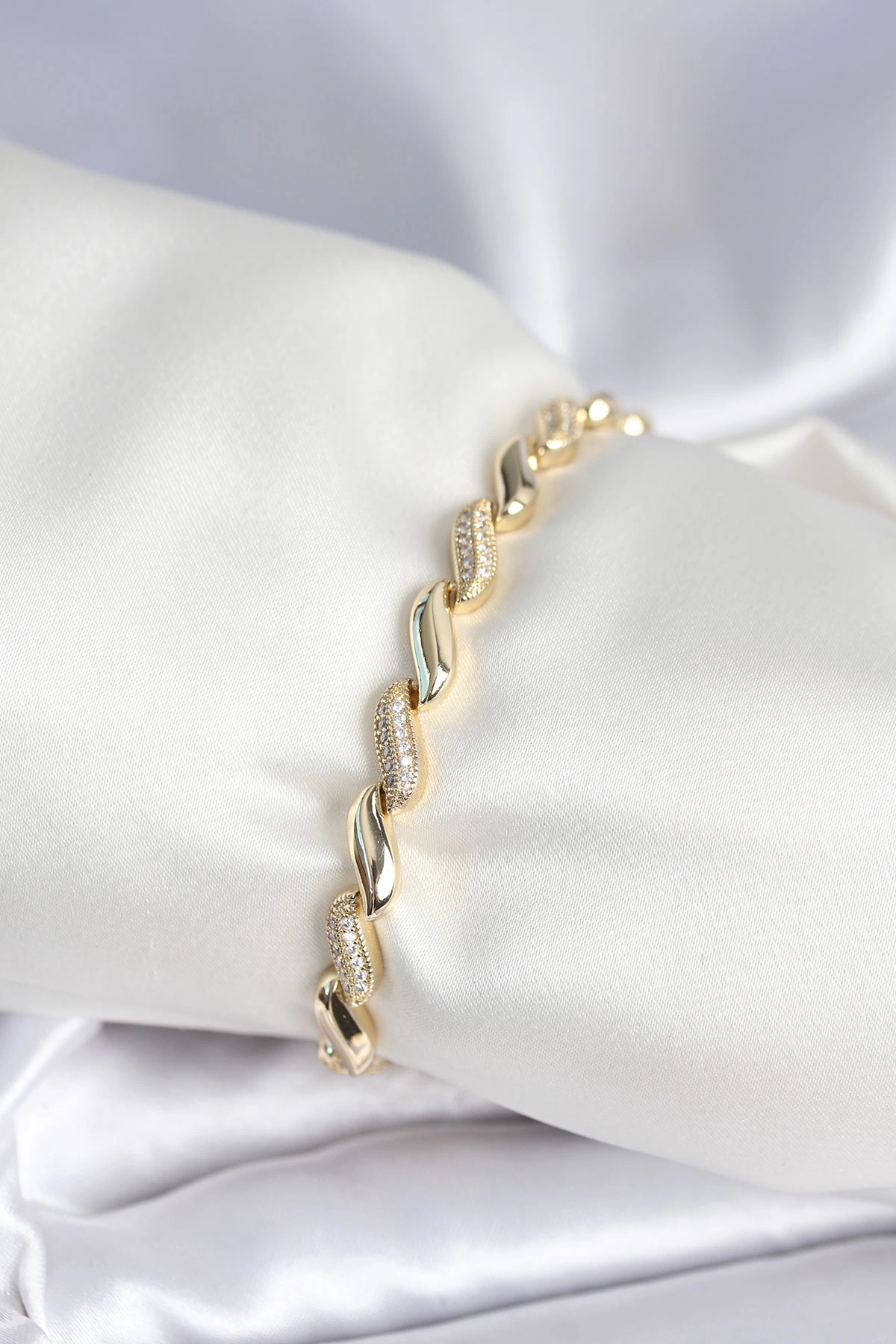 Pirinç Gold Renk Zirkon Taşlı Sarmal Model Kadın Bileklik