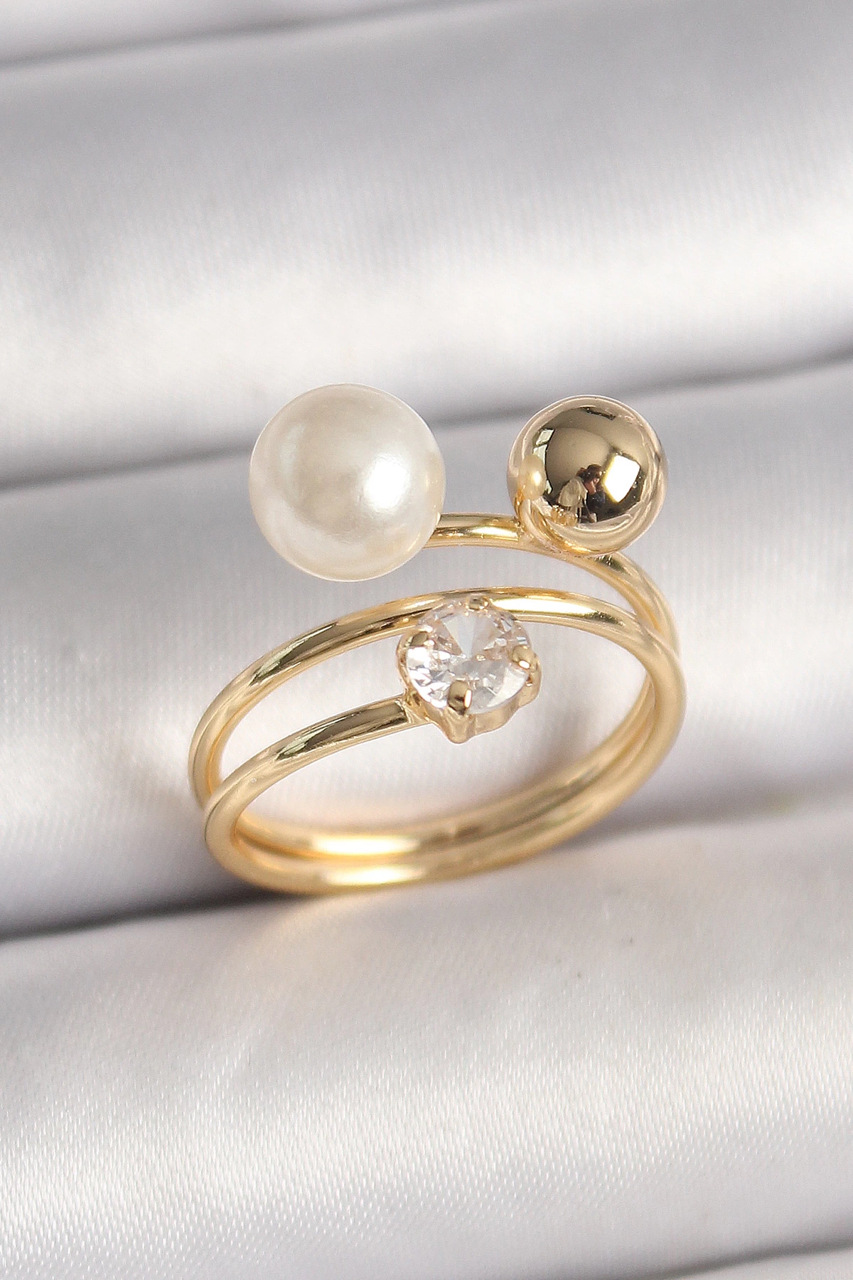 Pirinç Gold Renk Zirkon Taşlı Top İnci Model Kadın Yüzük