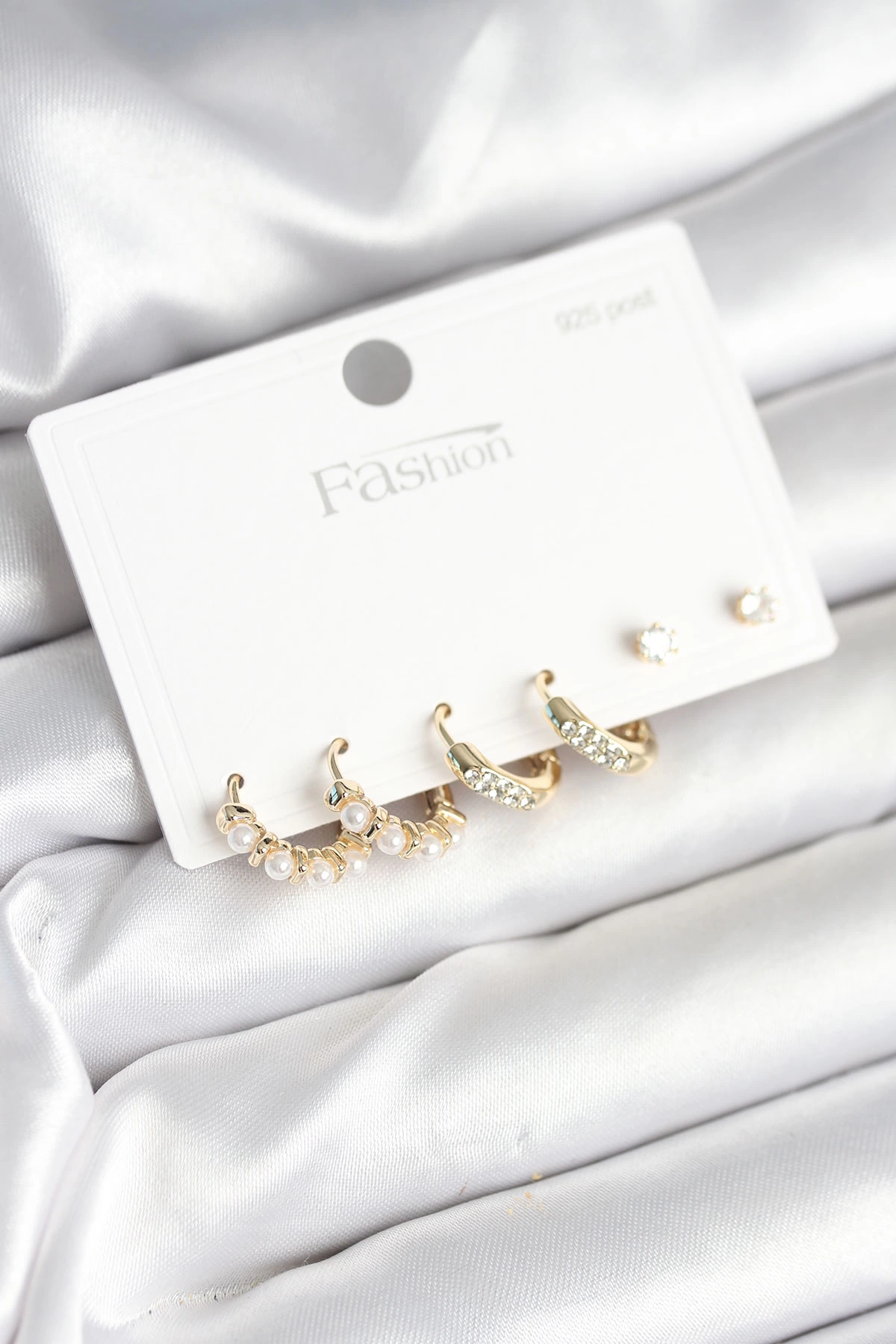Pirinç Gold Renk Zirkon Taşlı Ve İncili Model 925 Ayar Gümüş Çivi Kadın Küpe Seti