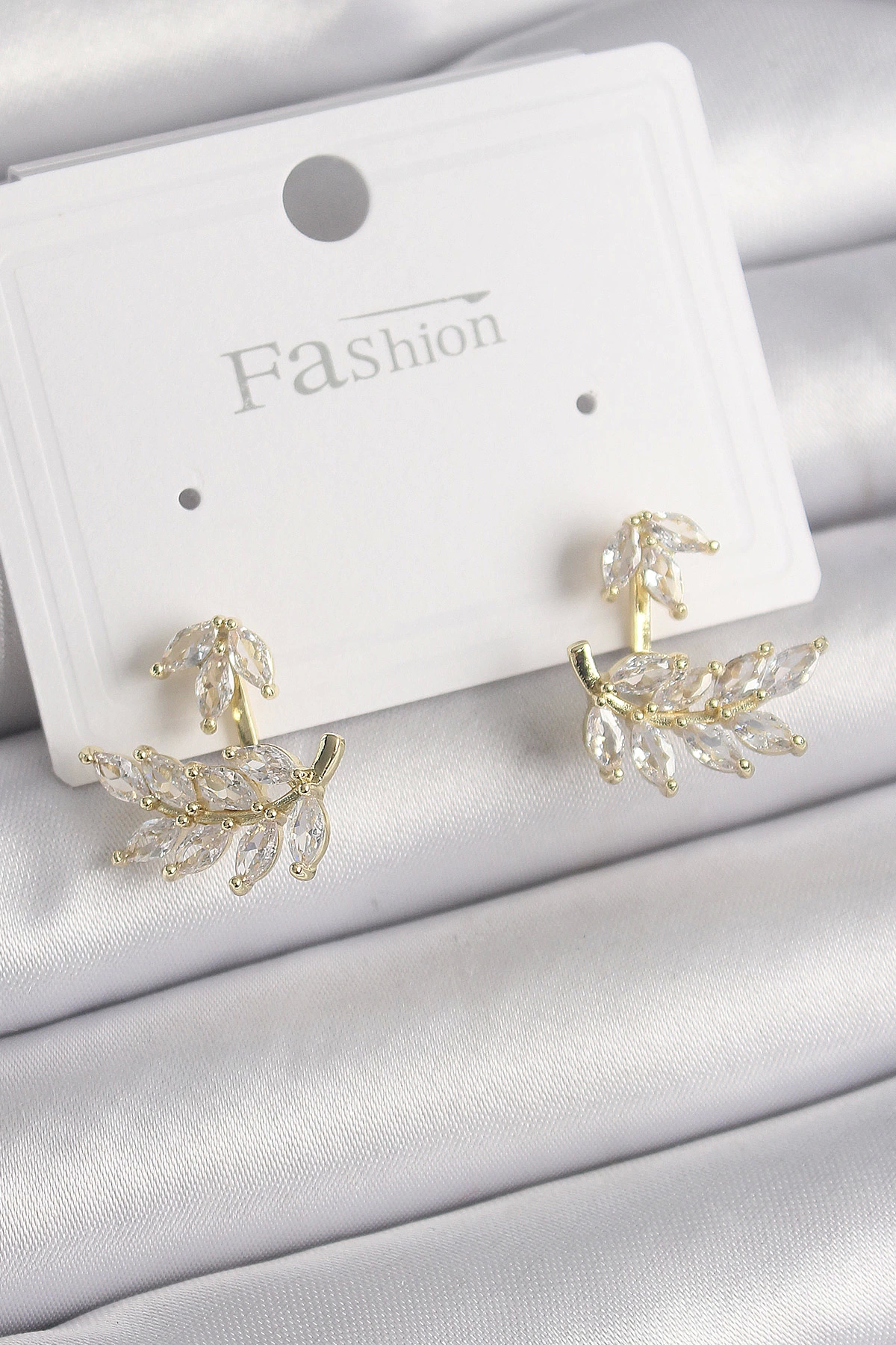 Pirinç Gold Renk Zirkon Taşlı Yaprak Model Kadın Küpe