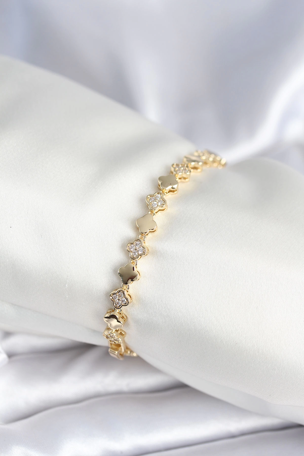 Pirinç Gold Renk Zirkon Taşlı Yonca Model Kadın Bileklik