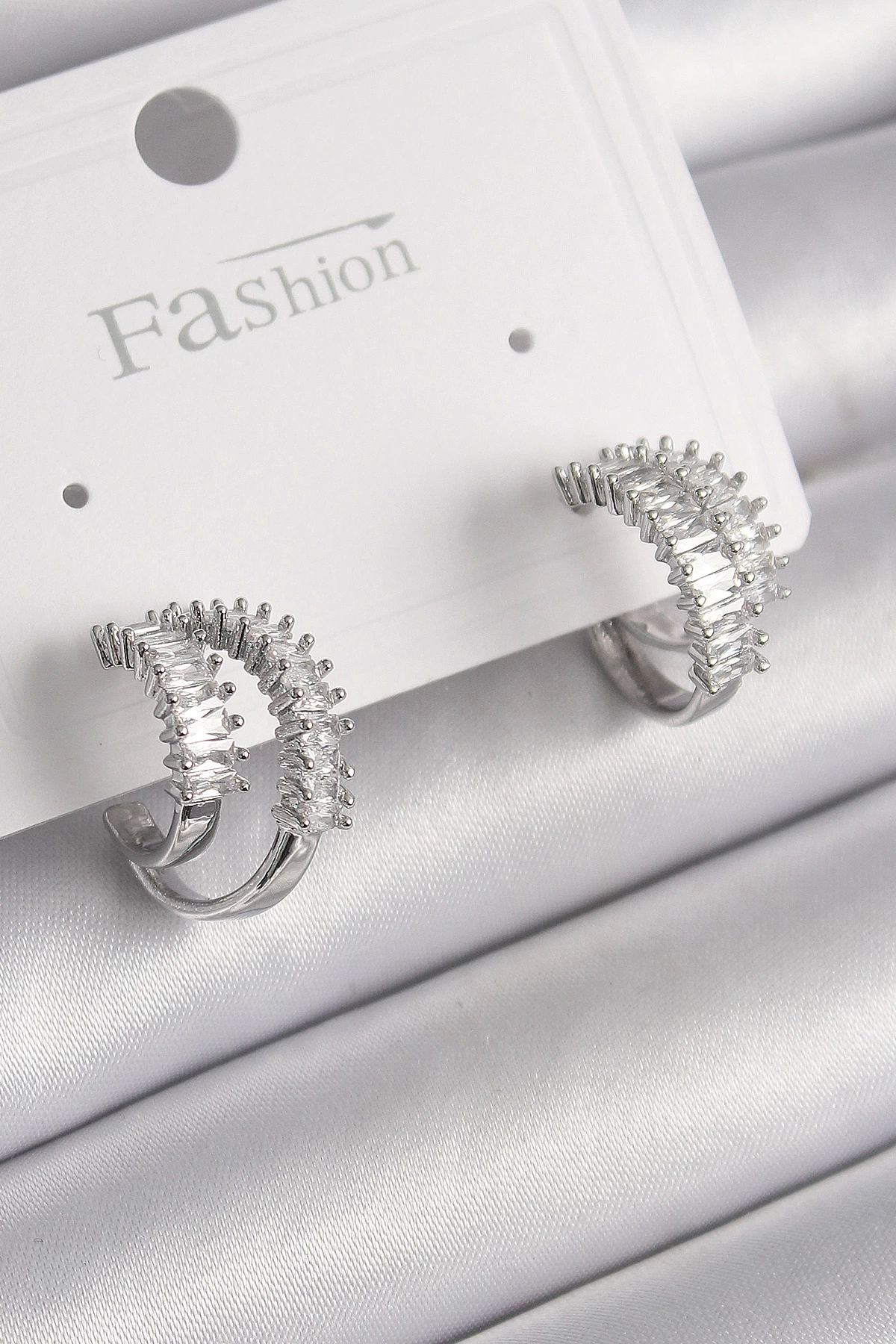 Pirinç Gümüş Renk 2'li Zirkon Taşlı Halka Model Kadın Küpe