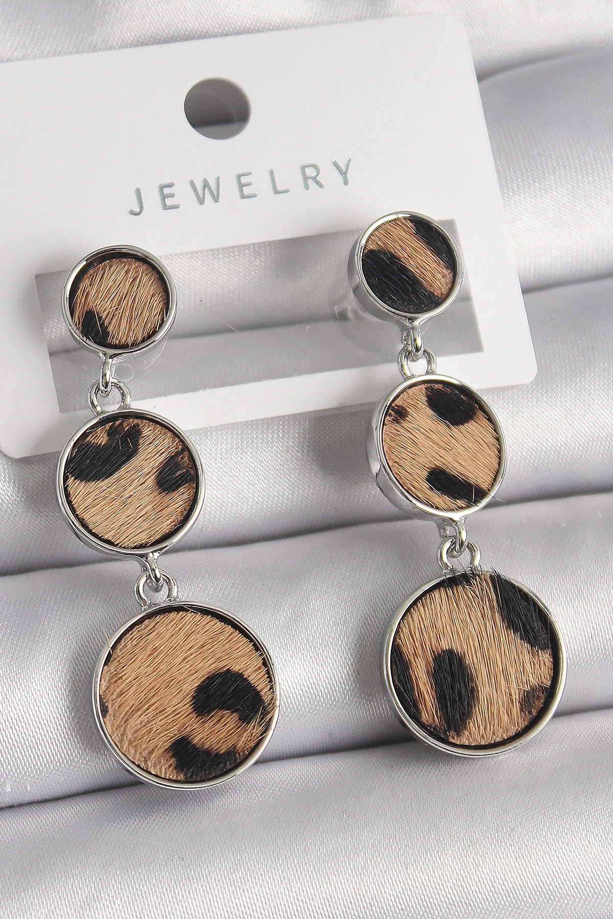 Pirinç Gümüş Renk 3'lü Daire Plaka Leopar Desenli Kadın Küpe