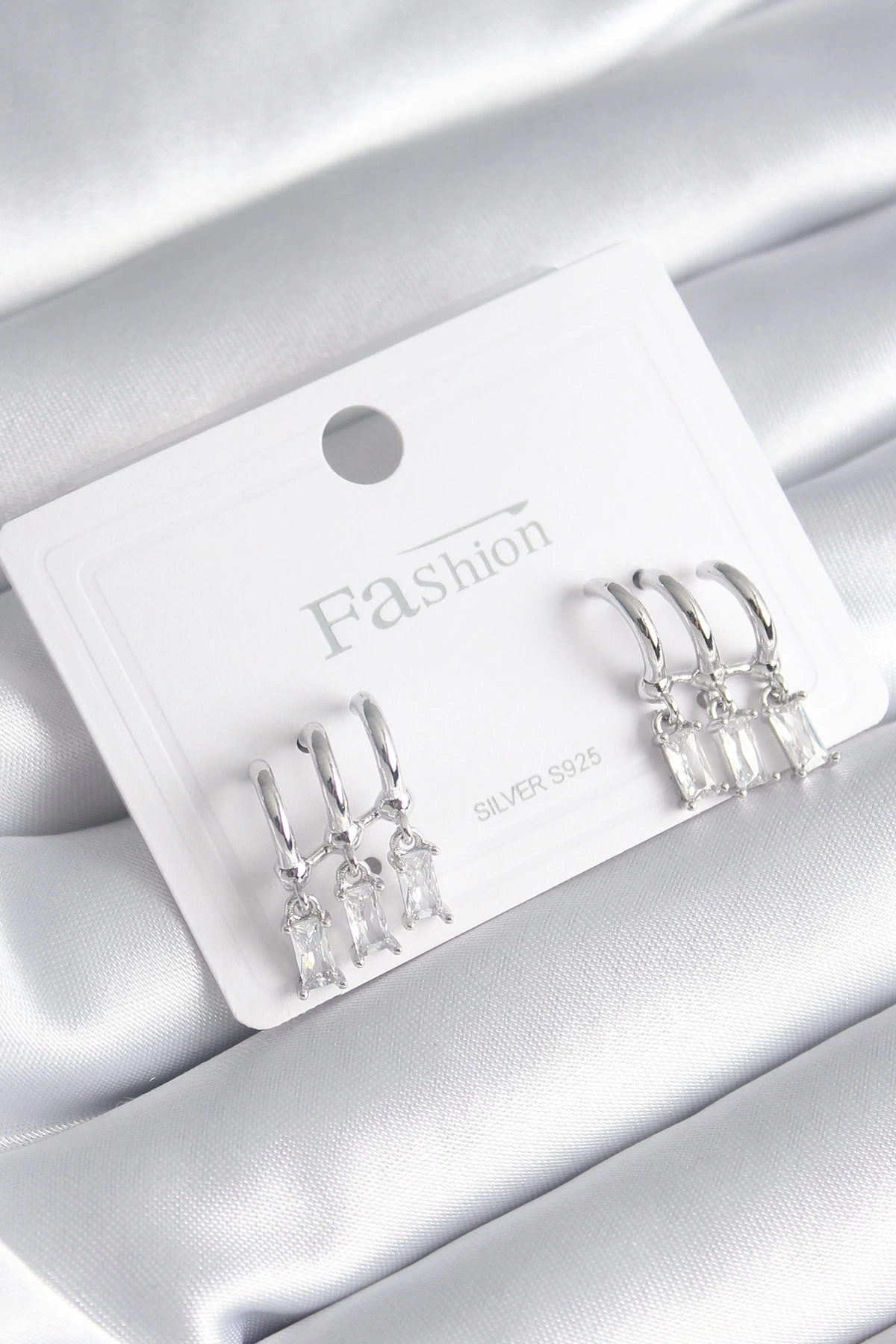 Pirinç Gümüş Renk 3'lü Sallantı Zirkon Taşlı Küpe