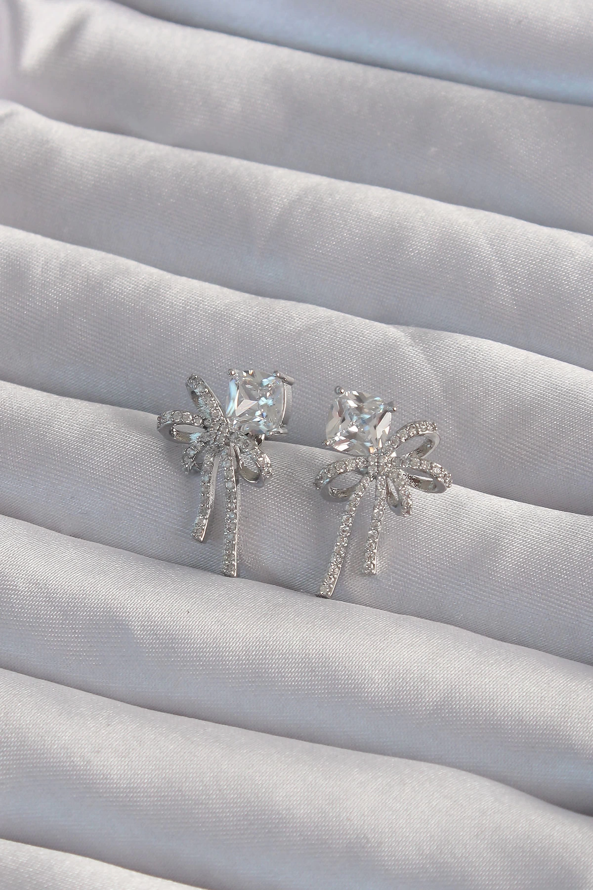 Pirinç Gümüş Renk Kare Zirkon Taşlı Fiyonk Küpe