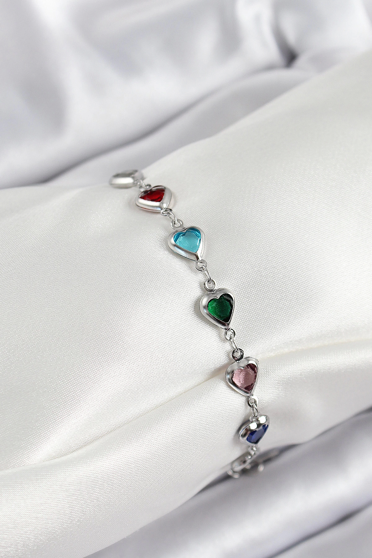Pirinç Gümüş Renk Karışık Renk Kalp Zirkon Taşlı Kadın Bileklik