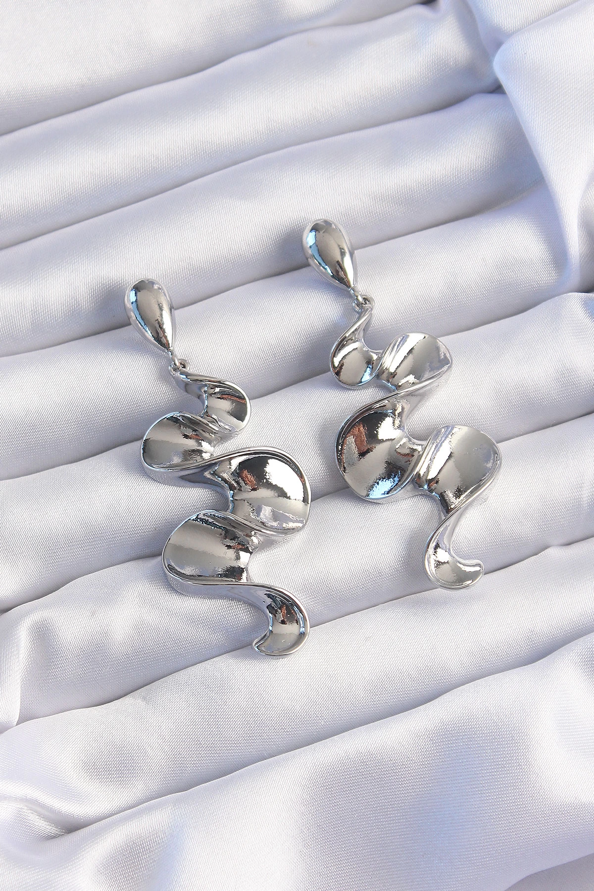 Pirinç Gümüş Renk Kıvrımlı Sallantılı Küpe