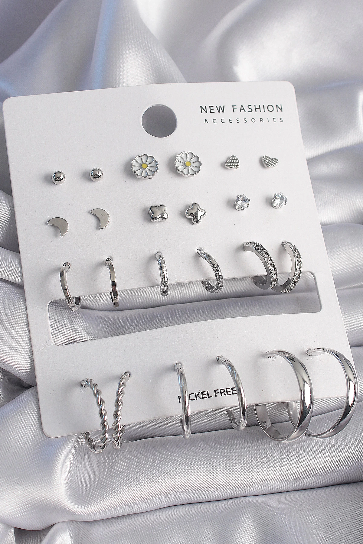 Pirinç Gümüş Renk Papatya Detaylı 12 Çift Kadın Küpe Seti