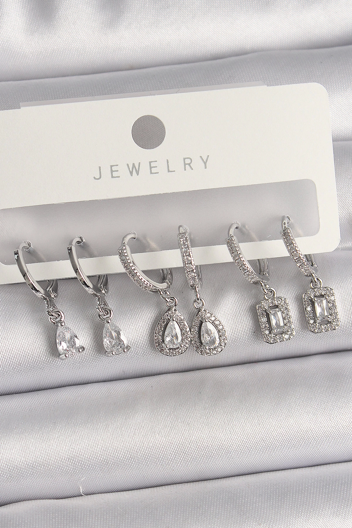 Pirinç Gümüş Renk Sallantı Zirkon Taşlı Damla Model Kadın Küpe Seti