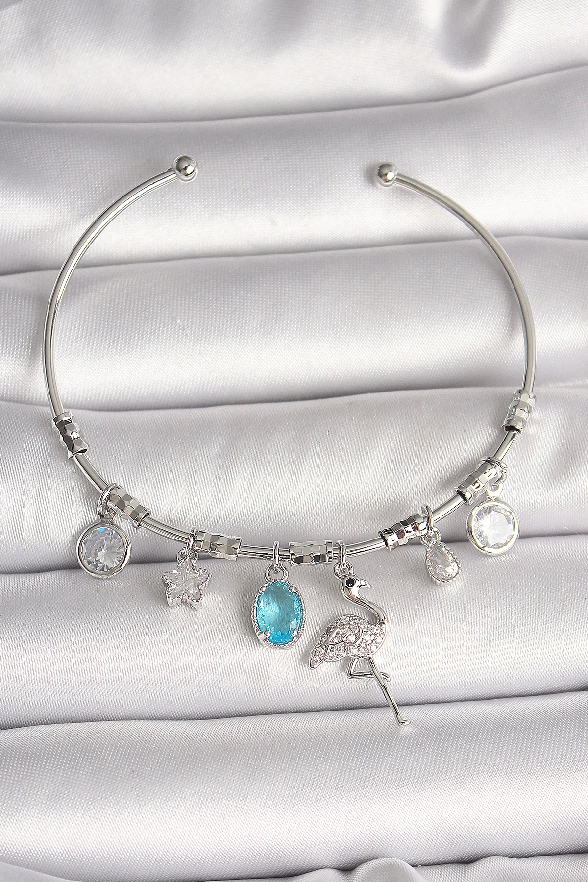 Pirinç Gümüş Renk Sallantı Zirkon Taşlı Filaminga Figür Charm Kadın Bileklik