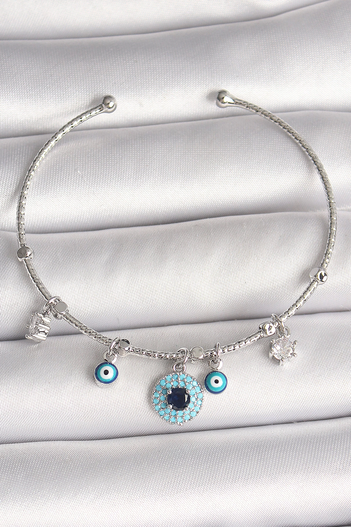 Pirinç Gümüş Renk Sallantı Zirkon Taşlı Nazar Boncuk Figür Charm Kadın Bileklik