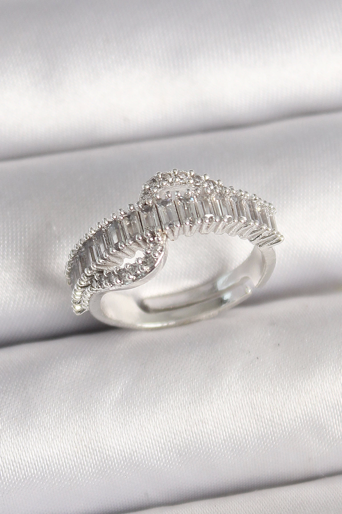 Pirinç Gümüş Renk Su Yolu Zirkon Taşlı Ayarlanabilir Model Kadın Yüzük