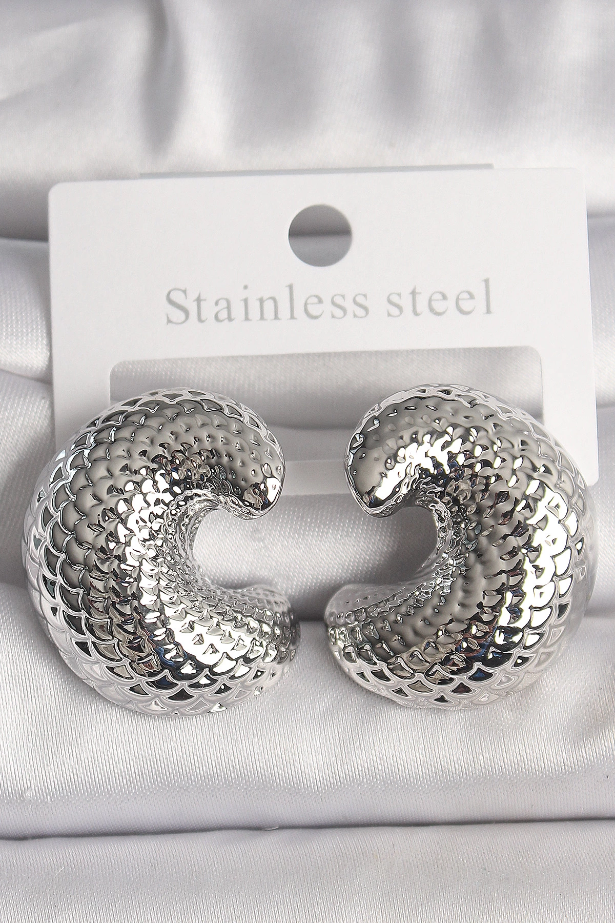Pirinç Gümüş Renk Yılan Sırtı İşlemeli Yarım Halka Model Kadın Küpe