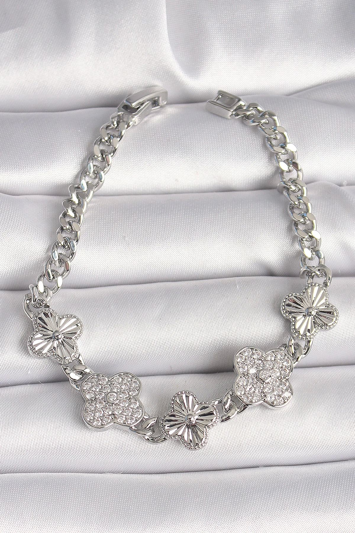 Pirinç Gümüş Renk Zincir Yonca Model Kadın Bileklik