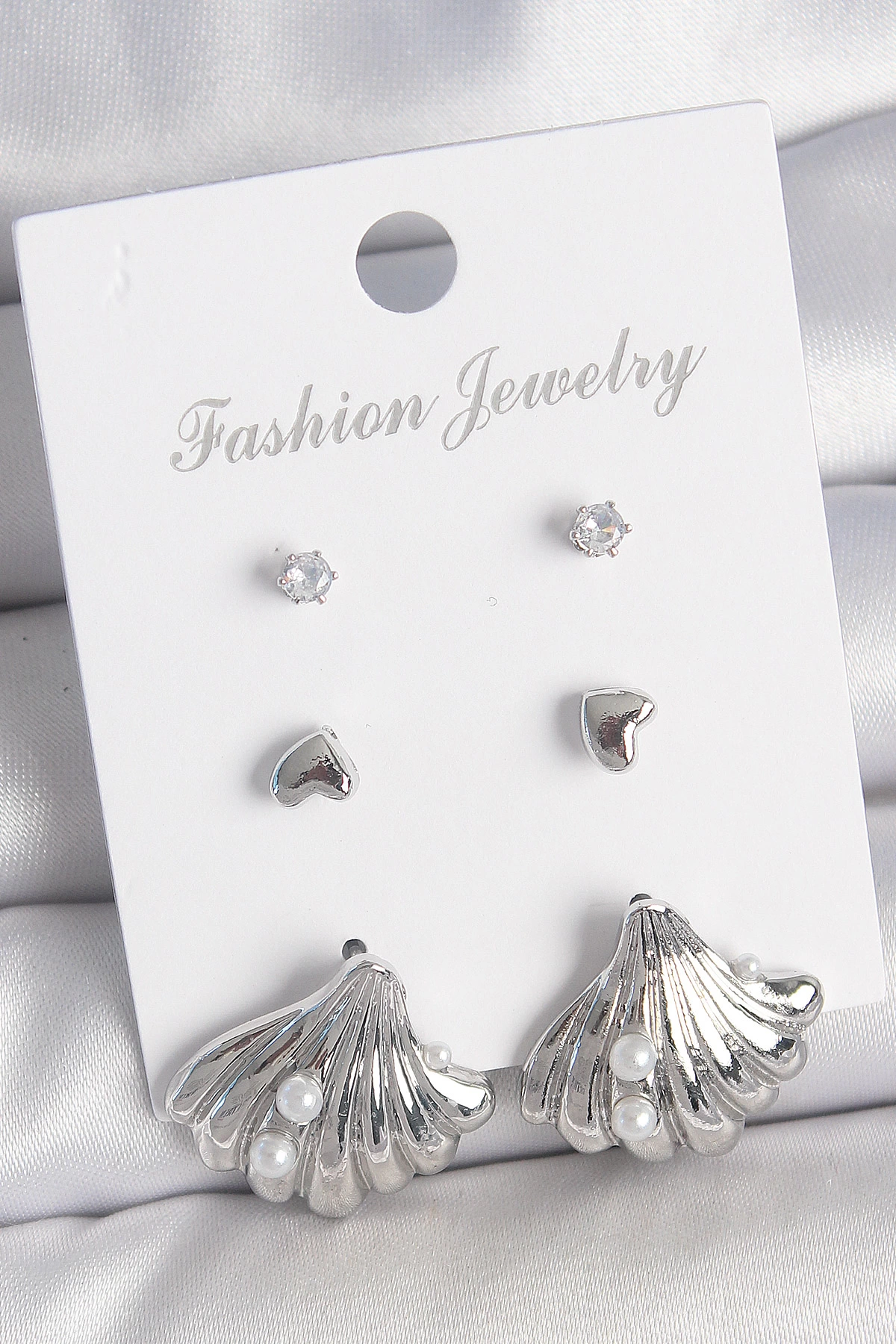 Pirinç Gümüş Renk Zirkon Taş Detaylı İnci Detaylı Deniz Kabuğu Model 3 Çift Kadın Küpe