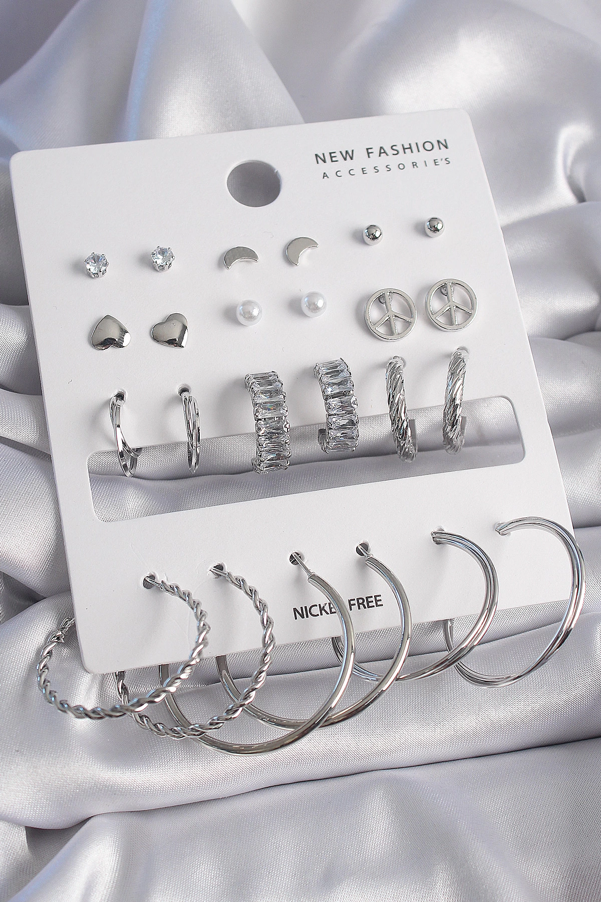Pirinç Gümüş Renk Zirkon Taşlı 12 Çift Kadın Küpe Seti