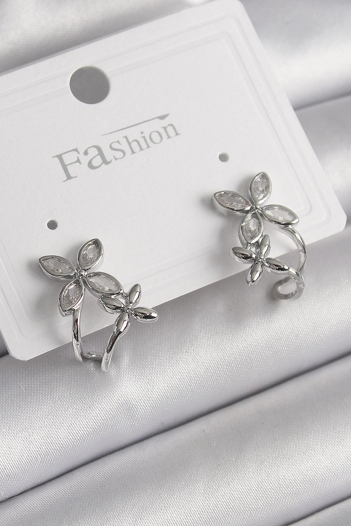 Pirinç Gümüş Renk Zirkon Taşlı 2'li Çiçek Model Kadın Küpe