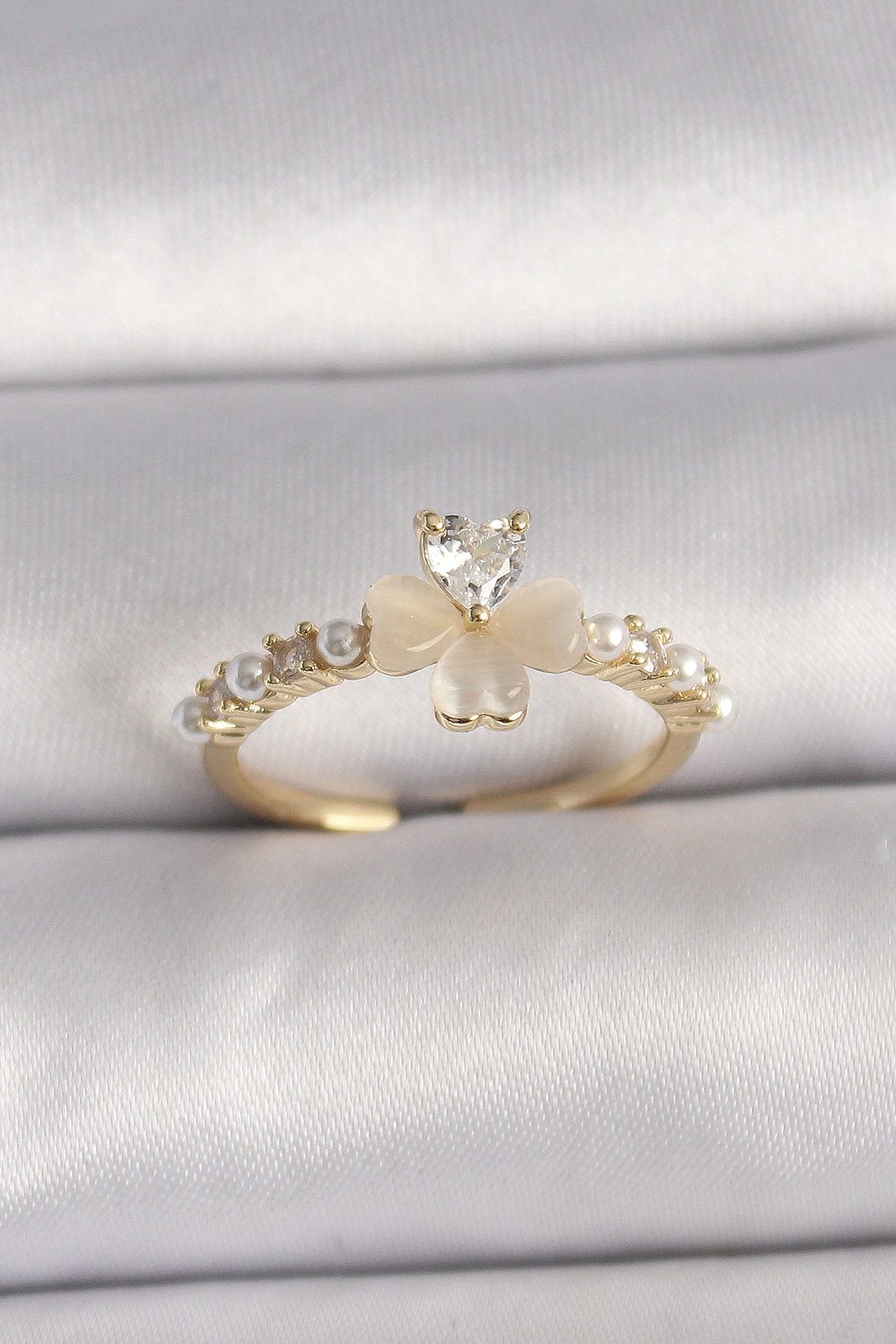 Pirinç Gümüş Renk Zirkon Taşlı Beyaz Mineli Yonca Model İnci Detay Ayarlanabilir Yüzük