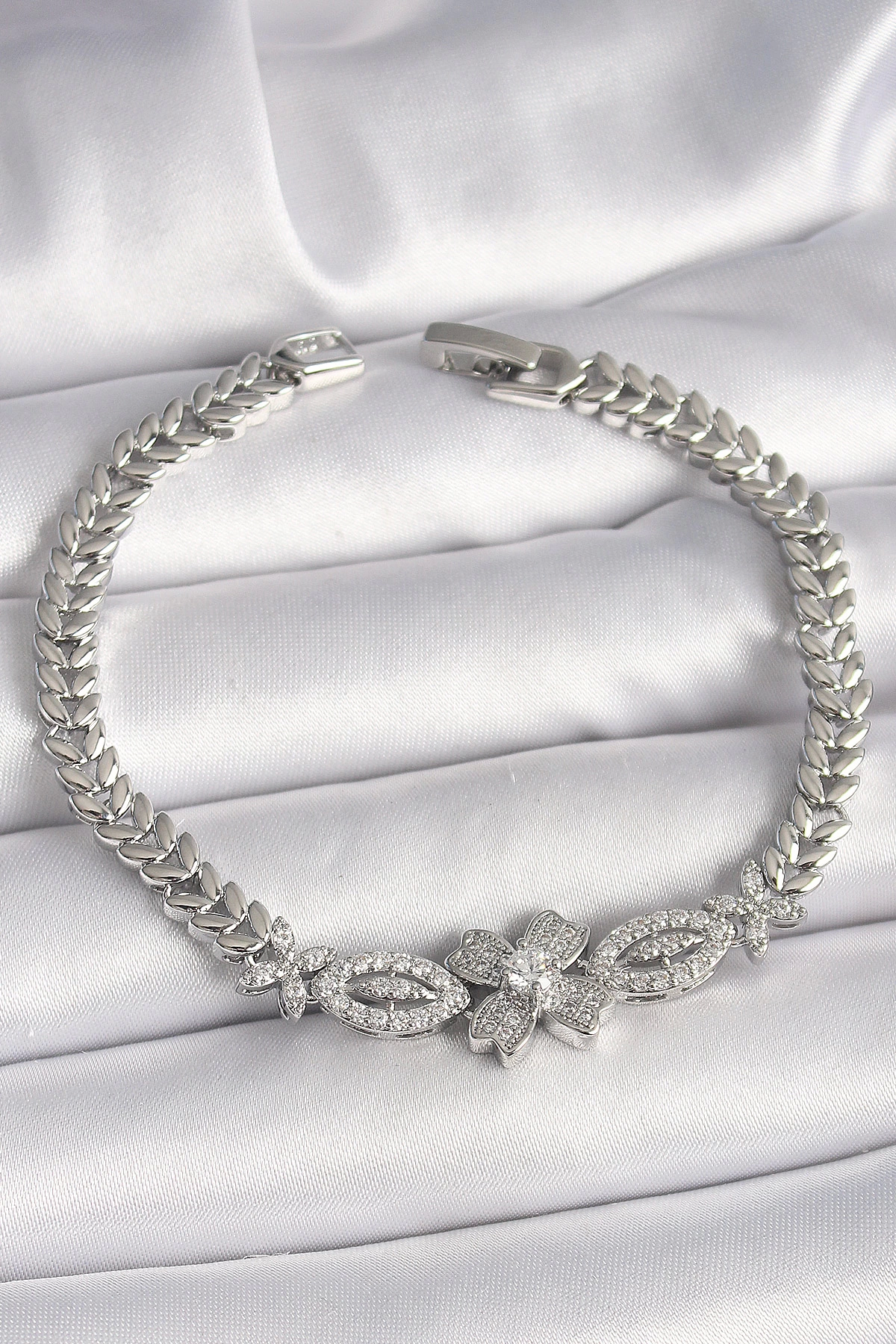 Pirinç Gümüş Renk Zirkon Taşlı Çiçek Figür Arpa Zincir Model Kadın Bileklik