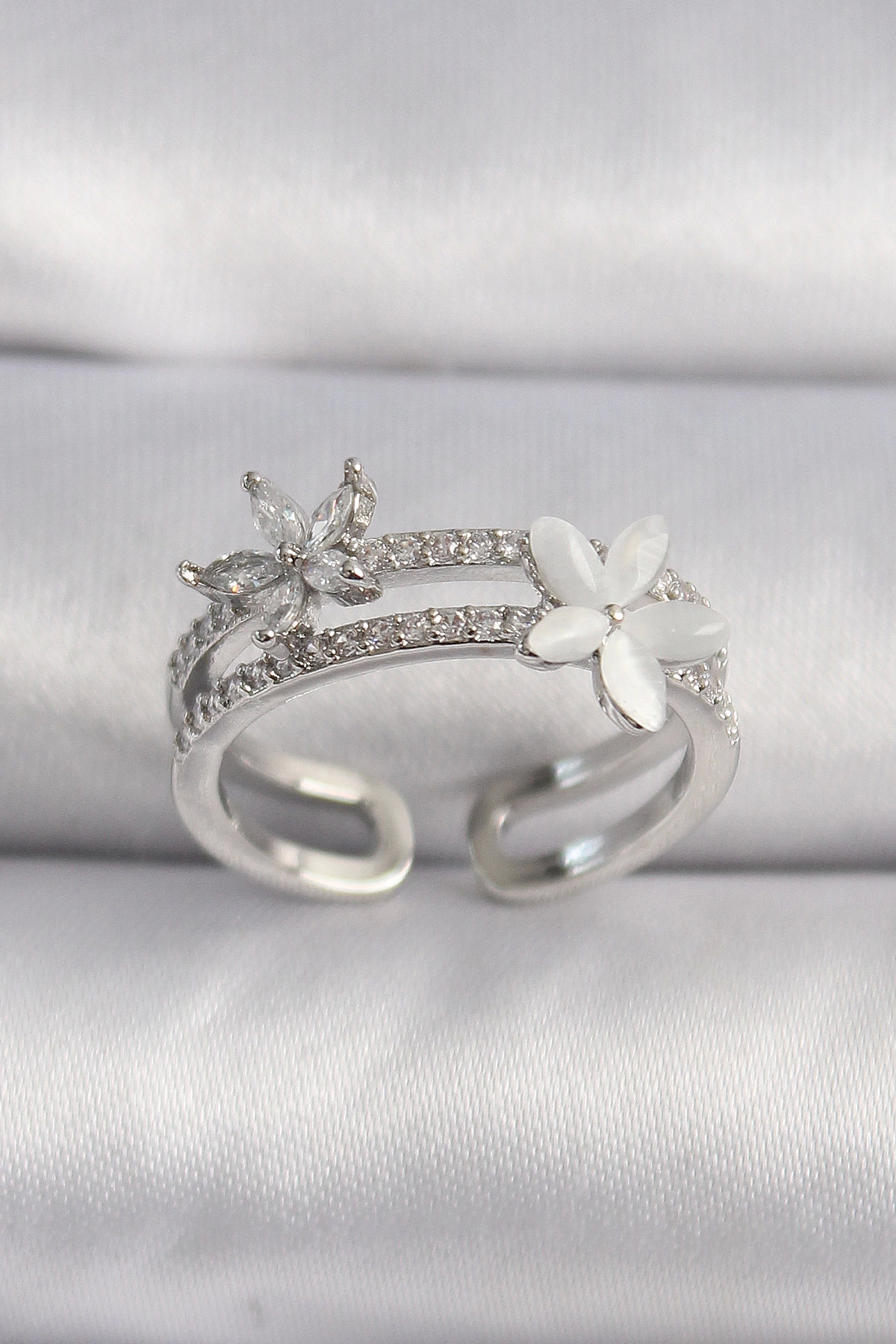 Pirinç Gümüş Renk Zirkon Taşlı Çiçek Model Vıp Seri Kadın Yüzük