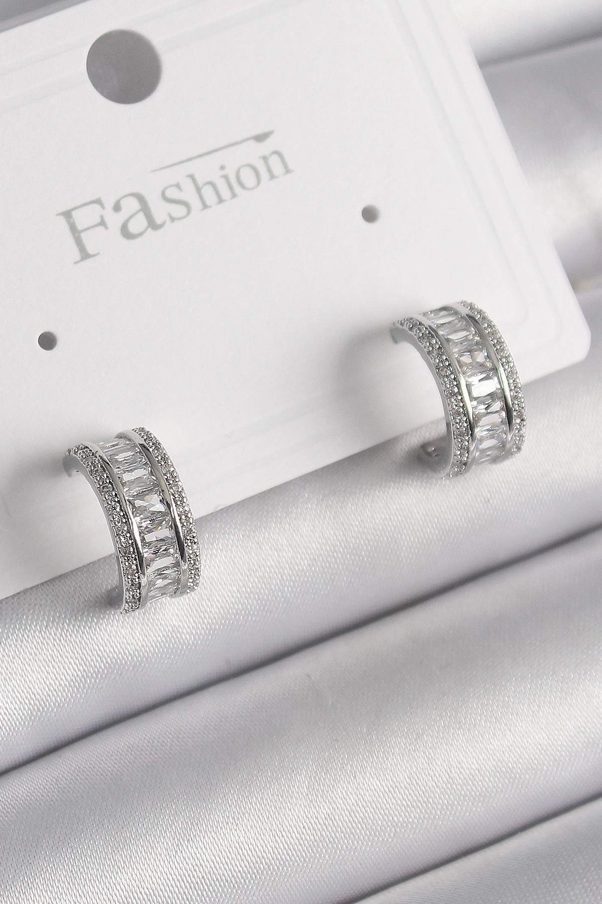 Pirinç Gümüş Renk Zirkon Taşlı Halka Model Kadın Küpe