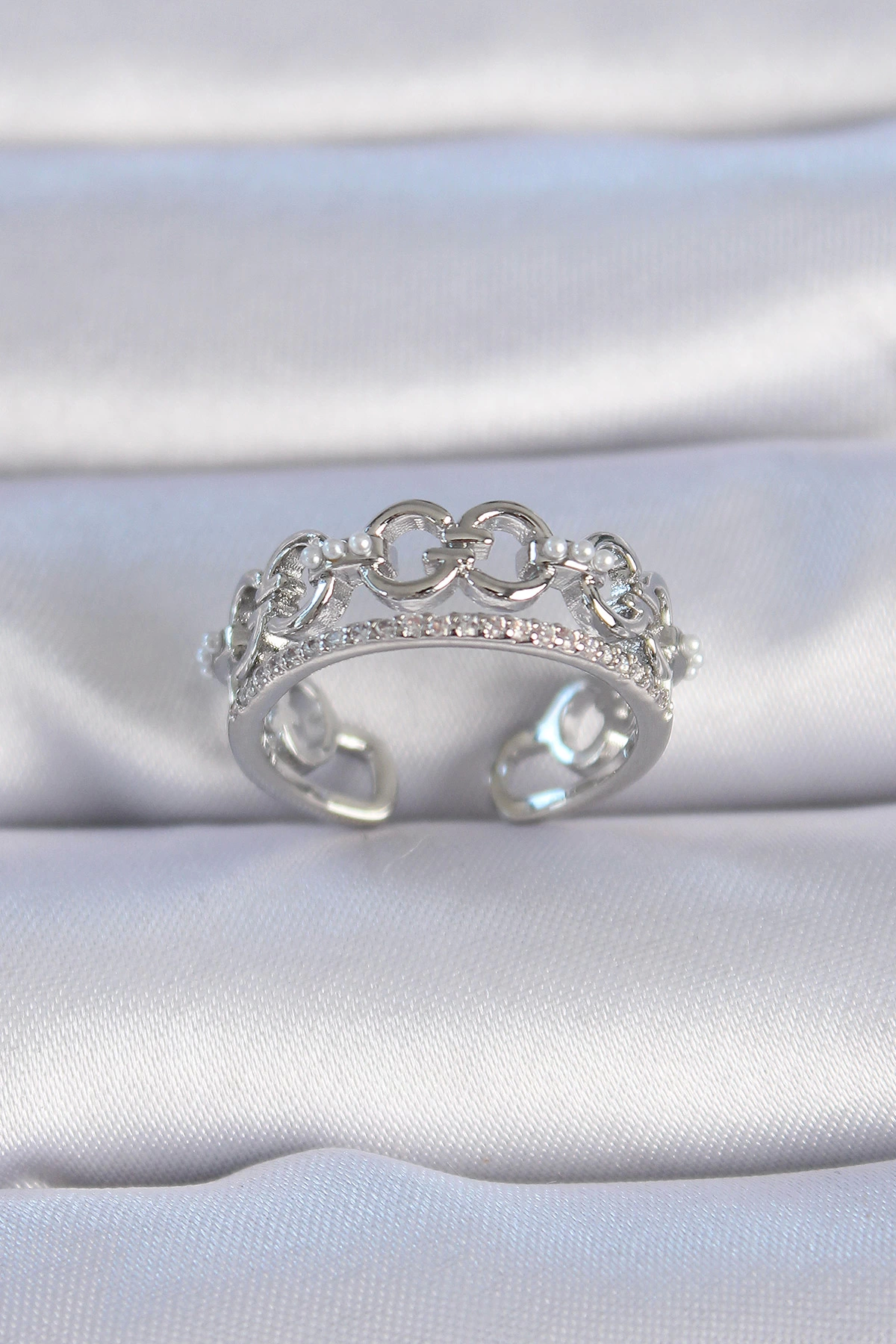Pirinç Gümüş Renk Zirkon Taşlı İnci Detay Kadın Yüzük
