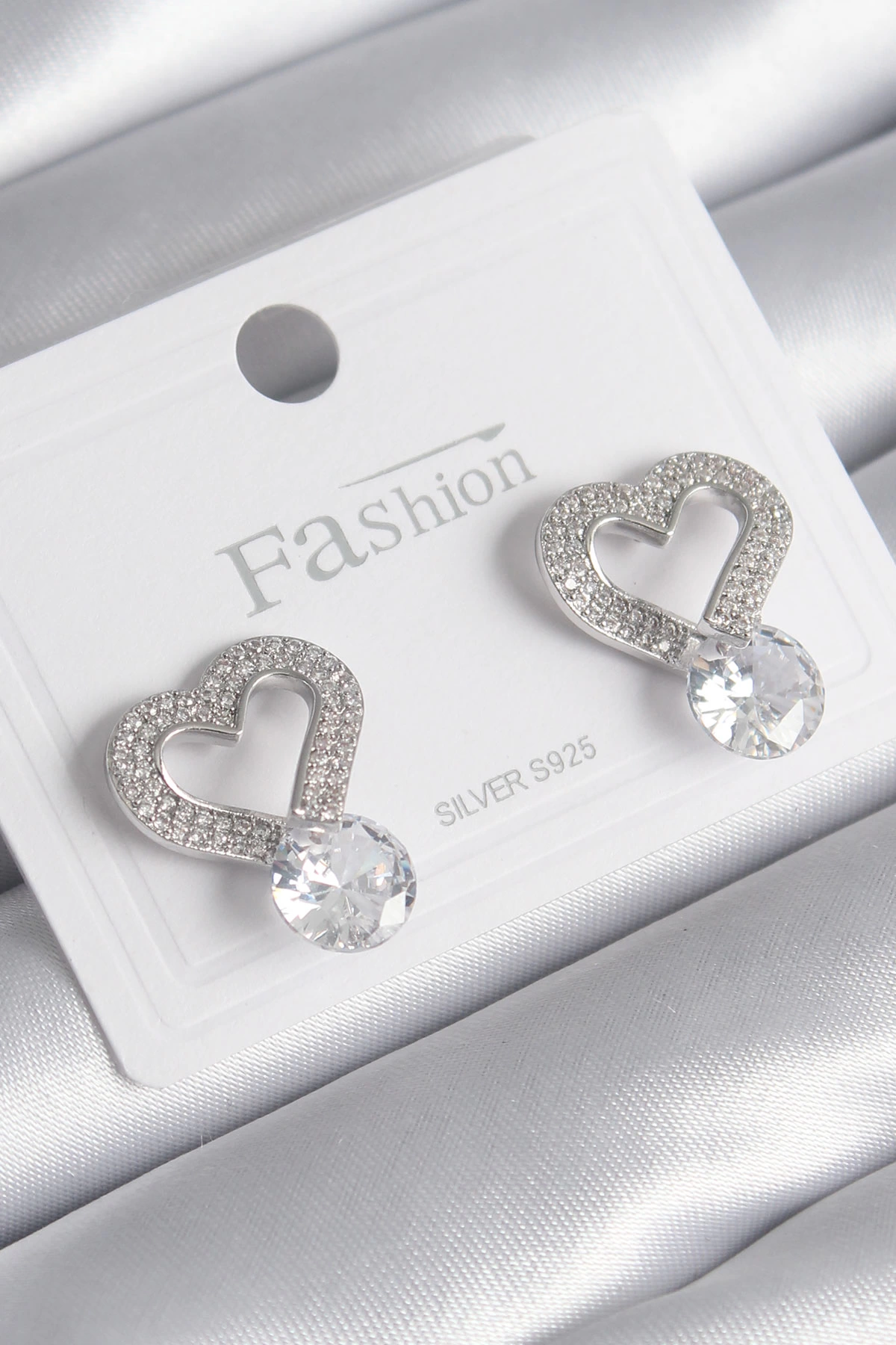 Pirinç Gümüş Renk Zirkon Taşlı Kalp Model Damla Zirkon Taş Detay Kadın Küpe
