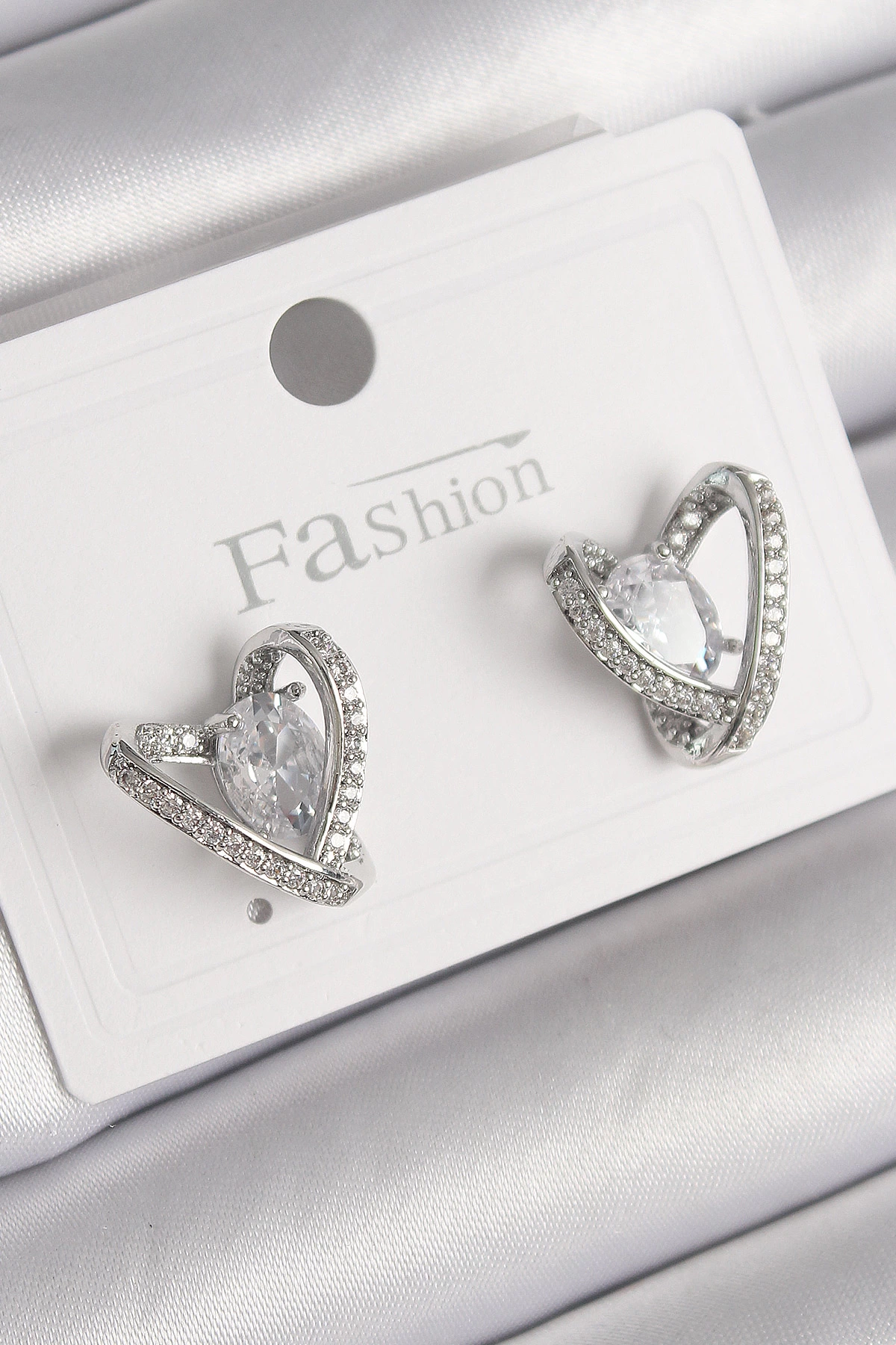 Pirinç Gümüş Renk Zirkon Taşlı Kalp Model Kadın Küpe