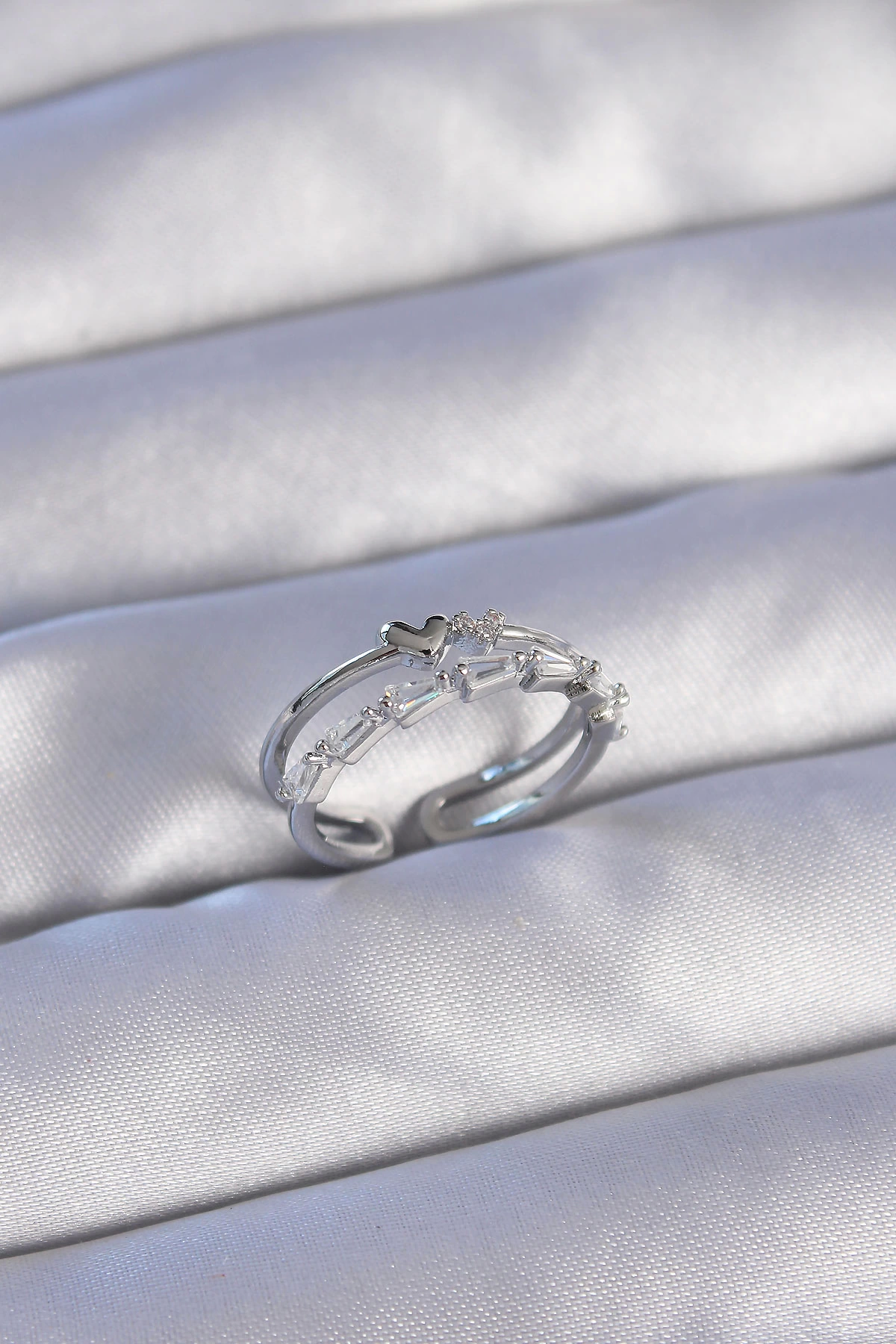 Pirinç Gümüş Renk Zirkon Taşlı Kalpli 2li Görünüm Ayarlanabilir Yüzük