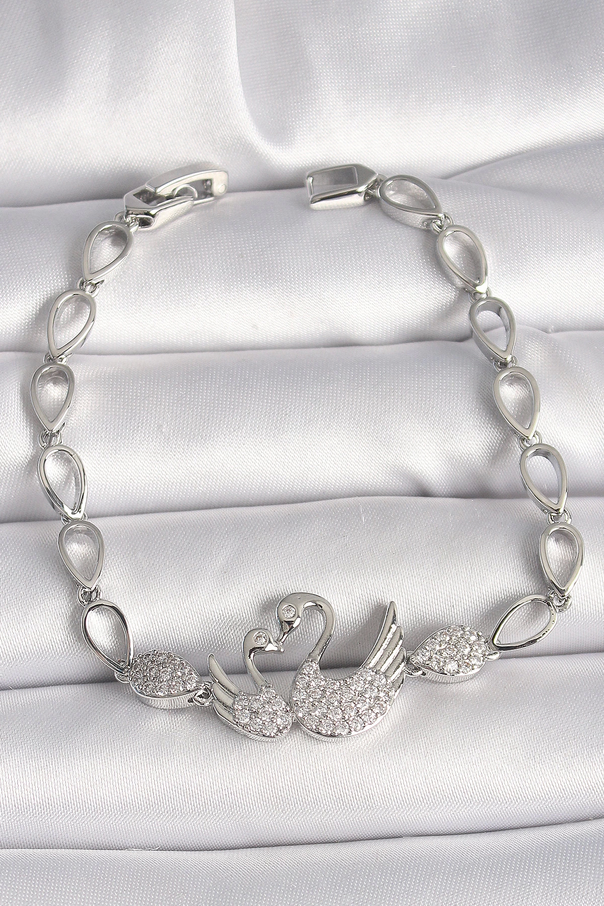 Pirinç Gümüş Renk Zirkon Taşlı Kuğu Figür Damla Zincir Model Kadın Bileklik